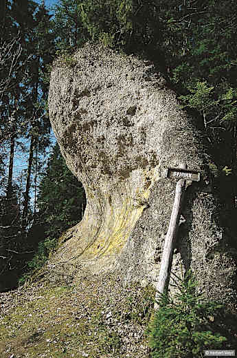 Moosbewachsene Dolomit-Felsburgen, teilweise durchlöchert, ragen aus dem geheimnisvollen Wald, Lehrtafeln erklären dem Wanderer die Baumvielfalt. Hinter dem Steinhüttle (gelbes Dreieck) imponiert das spitz geformte Wentalweible mit seinem kreuzgeschmückten Gipfel – ein wahrlich stimmungsvolles Bild. Die Felsformationen im oberen Talabschnitt wurden sogar mit Namen bedacht: da schnaubt das „Nilpferd", stolziert die „Sphinx" am Wegesrand. Auf die Markierungen achtend, kommen wir zum Gasthof im Wental.