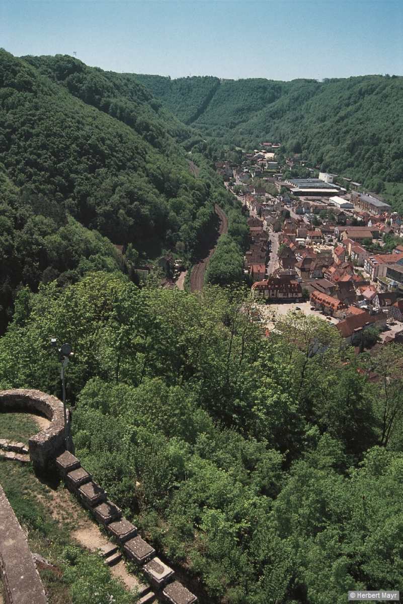 Über einen vorbildlichen Waldlehrpfad und durch einen Gang führt die Wanderung zur Burgruine Helfenstein. Foto: Herbert Mayr, Rother Bergverlag GmbH Geislingen and der Steige vom Aussichtsturm der Ruine Helfenstein. Foto: Herbert Mayr, Rother Bergverlag GmbH Am Ortsbeginn von Weiler leitet uns ein Waldlehrpfad hinüber zum Ödenturm. Foto: Herbert Mayr, Rother Bergverlag GmbH Bildergalerie (3)