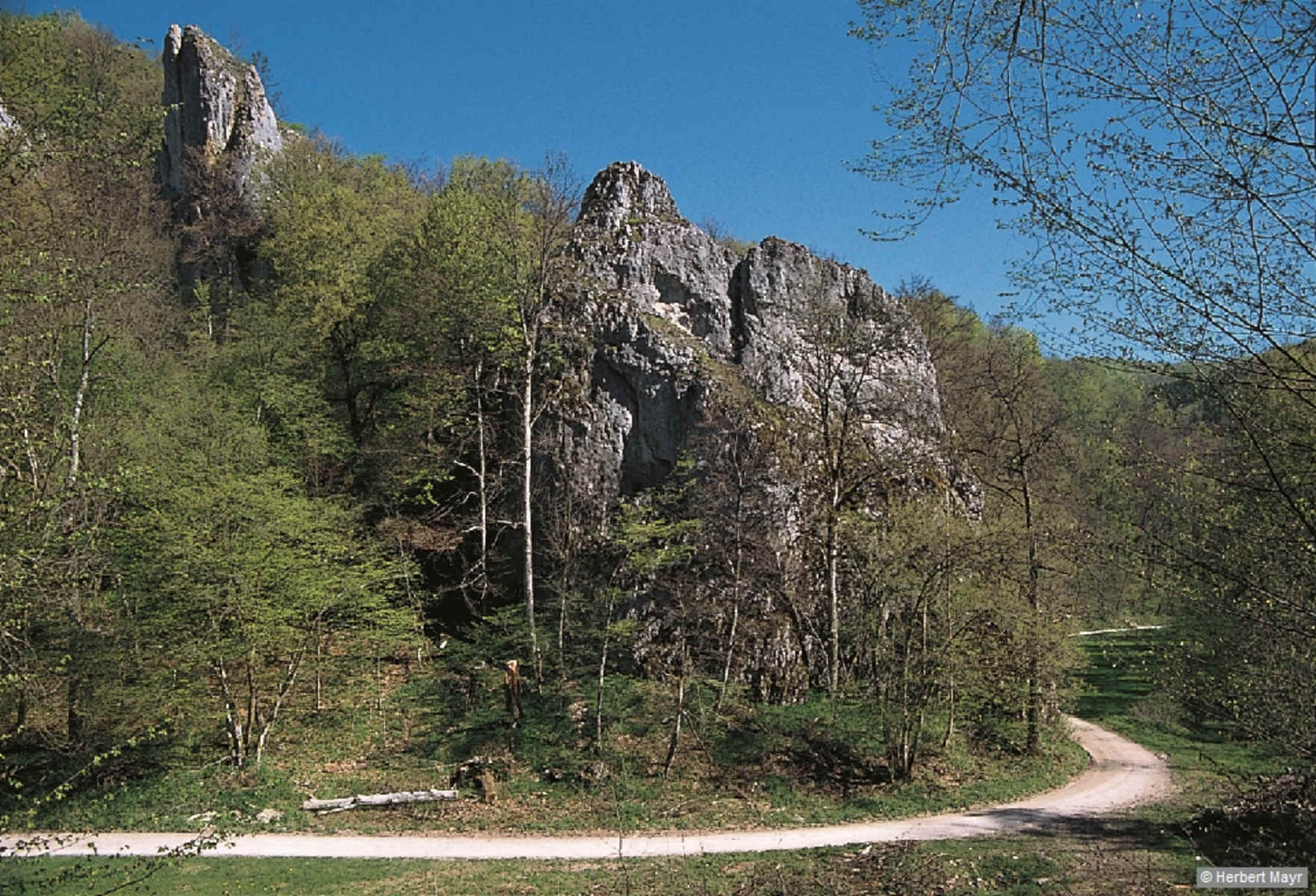 Die Felsformation Küssende Sau unterhalb der Ruine Günzelburg. Foto: Herbert Mayr, Rother Bergverlag GmbH