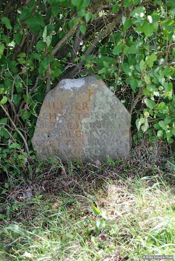 Wir nehmen den Weg wieder auf und erreichen Lauterbach. Dort halten wir uns an der Straße links und kommen an der Likörfabrik vorbei. Ein ganzes Stück weiter zweigt schräg rechts die Straße Oberdorf zur Kirche ab. Vor der Kirche geht es rechts die Straße hinauf; am Ende des Parkplatzes bietet sich schräg links ein Abstecher zur Wehrkirche an. Anschließend gehen wir ein Stück zurück, biegen links in die Straße und dann rechts in den Feldweg ein, den „Historischen Rundweg Lauterbach“. Bald führt links ein weiterer Abstecher zum Totenstein, der an einem Busch steht. Danach wandern wir weiter geradeaus, bis der Weg nach links schwenkt und in einen anderen Weg mündet. Ab der Kreuzung, an der wir geradeaus gehen, ist der Weg befestigt und mit E3 und grünem Balken gekennzeichnet.
