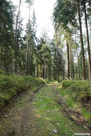 Am Bahnhof in Bad Brambach wenden wir uns zum Parkplatz und folgen links der Tafel mit Wanderkarte dem Vogtland Panorama Weg®, dessen VPW-Kennzeichnung uns fast die ganze Strecke über begleiten wird. An der Straße behalten wir die Richtung links der Gleise bei, erst ca. 200 m jenseits der B 92 ist rechts in die Straße Forst einzubiegen. Es geht unter der Bahnlinie durch. Der Weg schwenkt erst nach links, dann schräg rechts und führt links am Haus Nr. 9 vorbei. Am Waldanfang ist schräg links einzubiegen. Nun beginnt ein lauschiger, moosbedeckter Weg, der sanft ansteigt. Bei einem Grenzstein schwenkt der Weg nach rechts und wird für kurze Zeit zu einem Grenzweg. Am Stein 18/10 geht es geradeaus und rechts an der Schutzhütte vorbei, dann an der T-Kreuzung links und an einem Abzweig geradeaus. Der Weg wird nun breiter.
