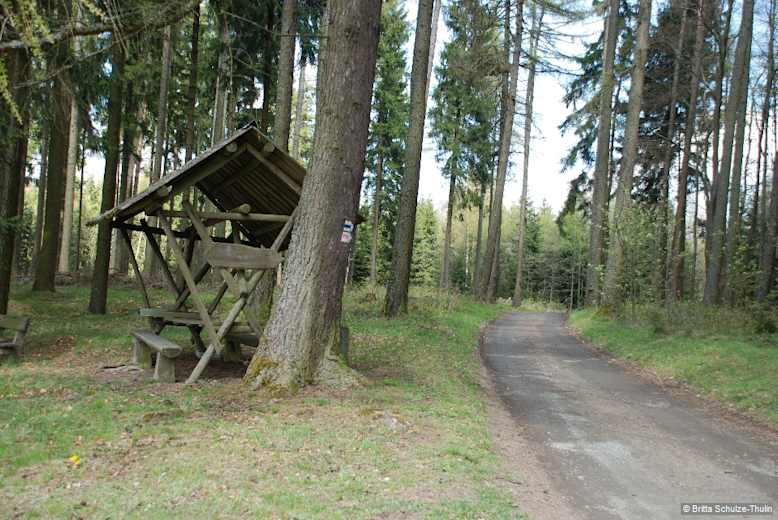 Anschließend gehen wir links am Turm vorbei und auf der anderen Seite, VPW-markiert, wieder hinunter. An einer Kreuzung wandern wir geradeaus weiter. Der Weg schwenkt nach schräg links, wieder gehen wir an einer Kreuzung geradeaus und an der nächsten rechts, bald aus dem Wald. An der Straße halten wir uns rechts und in Bärendorf an der T-Kreuzung links. Der höchstgelegene Ort des Oberen Vogtlands wirkt mit etwas Phantasie wie ein Gebirgsdorf. Vor dem Wald geht es rechts und hinter dem Teich schräg links zur Straße, dort geradeaus und vor dem Wald links. Bei einem Rastplatz schwenkt der Weg rechts in den Wald, wo wir stets dem Hauptweg folgen. Bald kommen wieder offenes Land und ein weiterer Rastplatz, dann schwenkt der Weg nach rechts und folgt erneut der Grenze zu Tschechien.