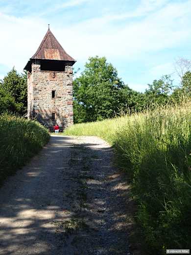 An einer Kreuzung folgen wir dem Talverlauf mit der grünen Raute geradeaus bis zur Bordmühle im Ortsteil Zell. Das gelbe L führt uns nach rechts auf die Gronauer Straße, die wir nach dem Friedhof halblinks bergan wieder verlassen. An der zweiten Gabelung geht es nach links auf einen unbefestigten Weg. Nach einer Kuppe steigt der Weg ab zum nächsten Hohlweg, den wir nach einer Kehre nach rechts steil bergan wieder hinter uns lassen. An der T-Kreuzung wandern wir nach links und behalten den Weg oberhalb der Weinberge bei. Ein kleiner Abstecher nach rechts führt zum Luginsland. Der auch als „Blaues Türmchen" bezeichnete, im Stil des Späthistorismus erbaute Aussichtsturm war Teil des Baßmannparks, eines ehemaligen Landschaftsparks, der zur Zeit der vorletzten Jahrhundertwende von einem Wormser Textilfabrikanten angelegt wurde. Wir gehen ein kurzes Stück zurück und folgen dann rechts der gelben 1 auf einem üppig überwucherten Weg zwischen den Weinbergen nach Bensheim-Zell. Hier könnten wir den Fußweg entlang der Gronauer Straße benutzen. Ruhiger hingegen ist jedoch die Route, die zunächst geradeaus auf der Gegenseite bergan führt. Nach Eintauchen in den Wald knickt der Weg nach rechts; geradeaus ginge es hoch zum Hemsberg-Turm (s. Wanderung 15). Auf dem aussichtsreichen Panoramaweg lassen wir uns vom Burgensteig vorbei an der Kirche St. Crescens in die Altstadt leiten. Auf bekanntem Weg geht es zurück zum Bahnhof der Weinstadt Bensheim.