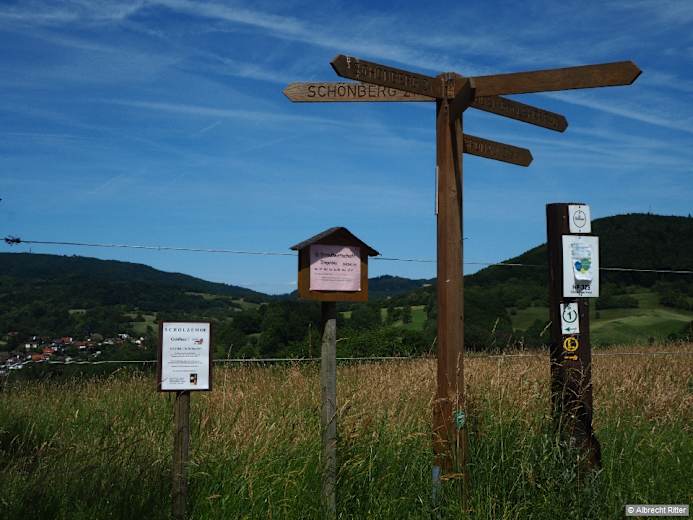 Eine hohe Lösswand zur Linken vermittelt einen ersten Eindruck der Mächtigkeit dieser eiszeitlichen Sedimentschichten. Kurz danach bleiben wir an der Verzweigung auf der linken Seite des kleinen Bachs und wandern durch den dunklen Hohlweg bergan. Nach einer halben Stunde verlassen wir den Wald und erreichen den Höhenzug der Striet mit Ausblicken bis hinüber zu Pfalz und Donnersberg. Das gelbe L führt uns links auf einen Panoramaweg durch eine fast parkähnliche Natur- und Kulturlandschaft. Durch saftige Wiesen vorbei an knorrigen alten Eichen verläuft der Weg bis zum Schönberger Kreuz. Das Kreuz am Verbindungsweg zwischen Gronau im Meerbachtal und Schönau im Lautertal wurde 1915 im Auftrag von Fürstin Marie zu Erbach-Schönberg errichtet und trägt die Inschrift „Land, Land, Land, höre des Herren Wort".