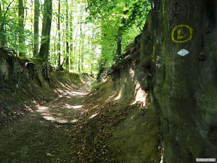 Wir verlängern über die Kreuzerstraße in den ansteigenden Kandelbornweg, verlassen das Dorf und erreichen im Wald den nächsten Hohlweg. Foto: Albrecht Ritter, Rother Bergverlag GmbH