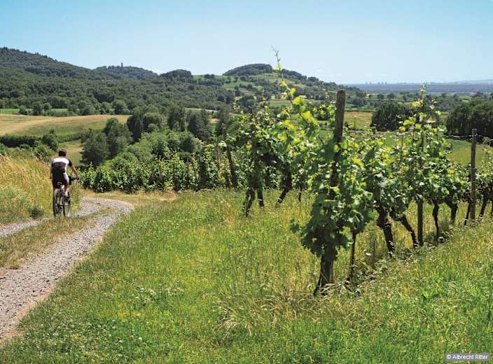 An der T-Kreuzung wandern wir nach links und behalten den Weg oberhalb der Weinberge bei. Ein kleiner Abstecher nach rechts führt zum Luginsland. Foto: Albrecht Ritter, Rother Bergverlag GmbH
