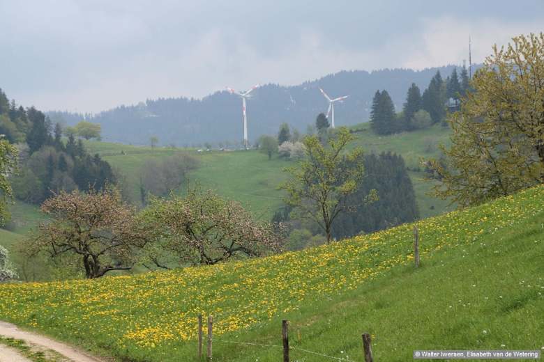 Wir biegen nach links und gehen auf aussichtsreicher Strecke Richtung Paulihof bis zum Wanderparkplatz Gerstenhalm. Von den beiden nach rechts abzweigenden Wegen nehmen wir den zweiten, leicht aufwärts führenden Bergwaldweg in Richtung Paulihof / St. Ulrich, der uns durch ein Waldstück hindurch zum Wegweiser Gerstenhalm führt, mit schönem Ausblick über Horben bis hinunter nach Freiburg. Wir biegen nun nach links Richtung St. Ulrich ab und folgen der Schotterpiste hinunter bis zu einer lang gezogenen Linkskurve. Mittendrin, etwa 50 m von der Einmündung in die Zufahrtsstraße zum Gerstenhalm-Parkplatz, biegen wir rechts auf einen Feldweg und nur 20 m weiter sogleich links ab auf einen Wiesenweg zwischen Kuhweiden hindurch. Er führt uns hinab zum Ortseingang von Geiersnest.