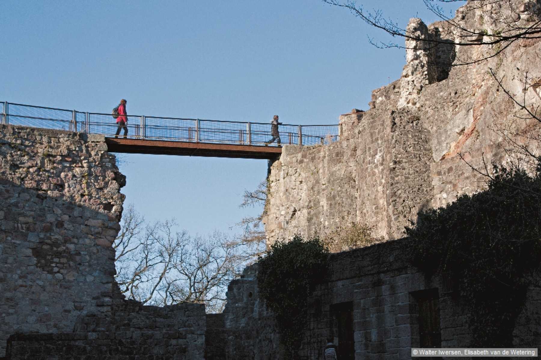 Steg auf der Ruine Hochburg. Foto: Walter Iwersen, Elisabeth van de Wetering, Bergverlag Rother