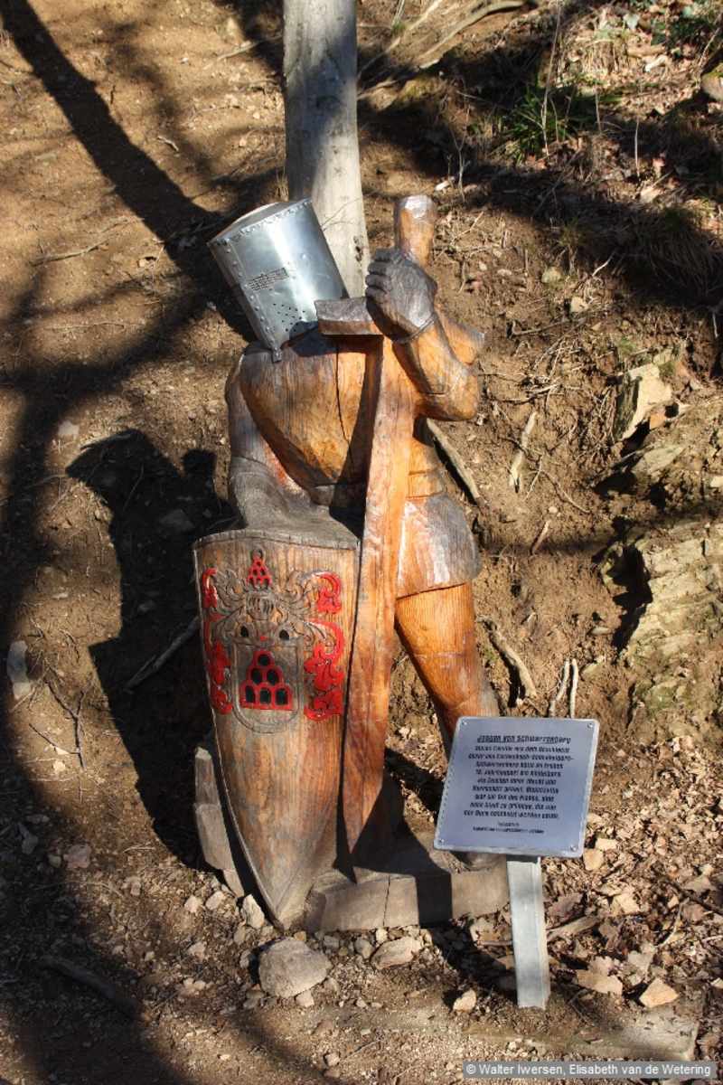Wir treten aus dem Bahnhofsgebäude in Waldkirch und gehen parallel zu den Bahngleisen rechts am Straßenrand entlang Richtung BDH-Klinik. Unser Weg führt über die Bahngleise, verläuft an der Einmündung des Max-Barth-Wegs vorbei und mündet in den Heitererweg, leicht ansteigend. Am Ende einer Reihenhauszeile zweigt rechts ein Stichweg ab, markiert mit dem Symbol des Kandelhöhenwegs. Er führt uns zu einem Wanderparkplatz, den wir links liegen lassen, und endet stumpf an einer Schranke. Ab hier beginnt der für Kinder angelegte Ritterweg, auf dem abwechselnd die beiden aus Holzstämmen geschnitzten Ritter Malterer und Ritter von Sulz von ihrem abwechslungsreichen Leben im Mittelalter erzählen. Die Geschichten sind auf Edelstahlblechen eingraviert. Der Weg endet an der Ruine der Kastelburg, zu deren Burghof mit Turm und Befestigungsmauer eine gut erhaltene Holzbrücke über den Burggraben führt. Belohnt wird der Aufstieg mit herrlichem Ausblick über die Dächer von Waldkirch und hinüber zum Kandel. Vom Burghof gehen wir zurück zur Holzbrücke, überqueren sie erneut und setzen unsere Burgentour nur wenige Meter hinter einer hölzernen Infotafel auf der rechten Seite auf einem Trampelpfad fort, markiert mit dem Zeichen des Kandelhöhenwegs und des Zweitälersteigs.