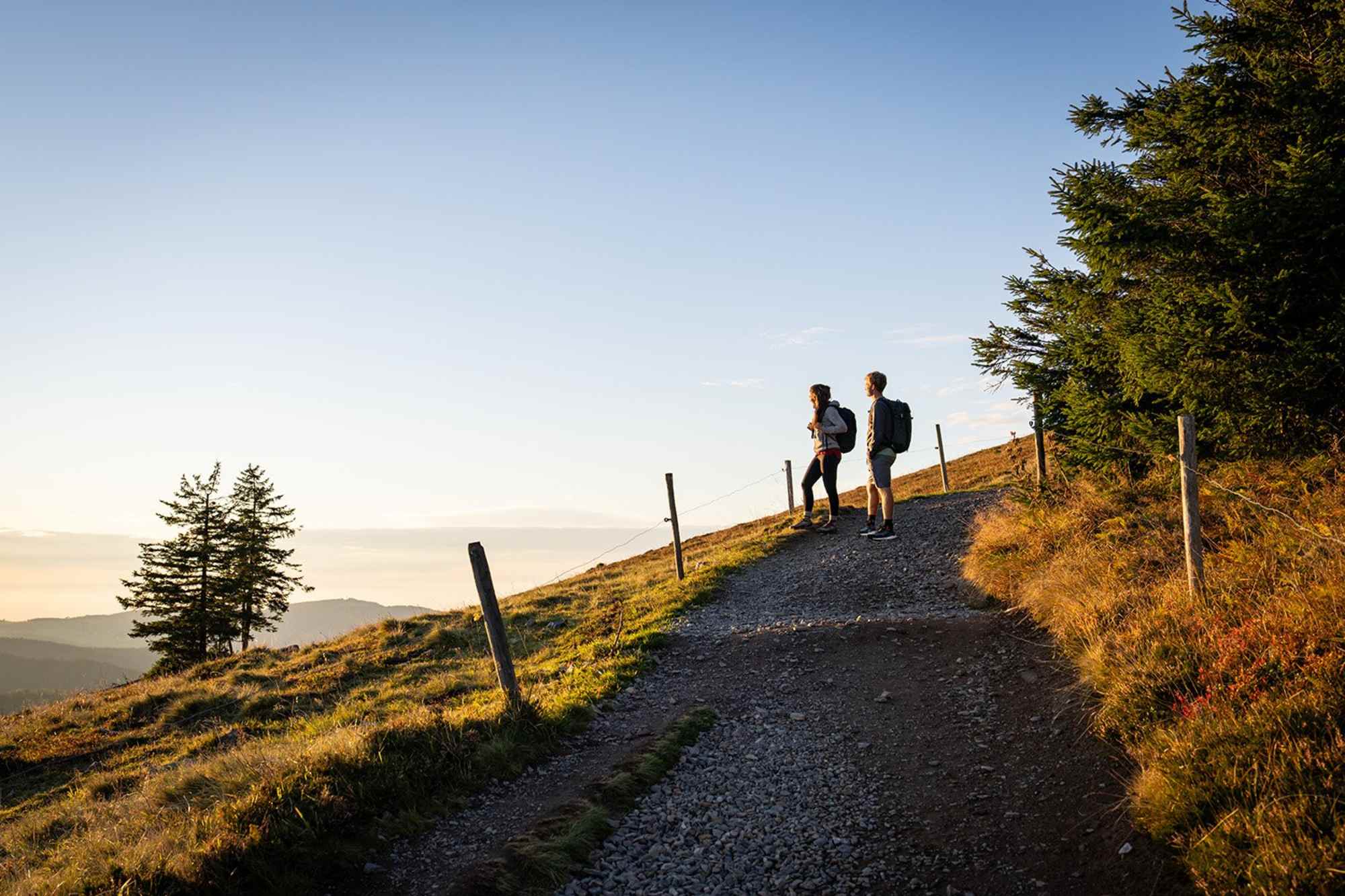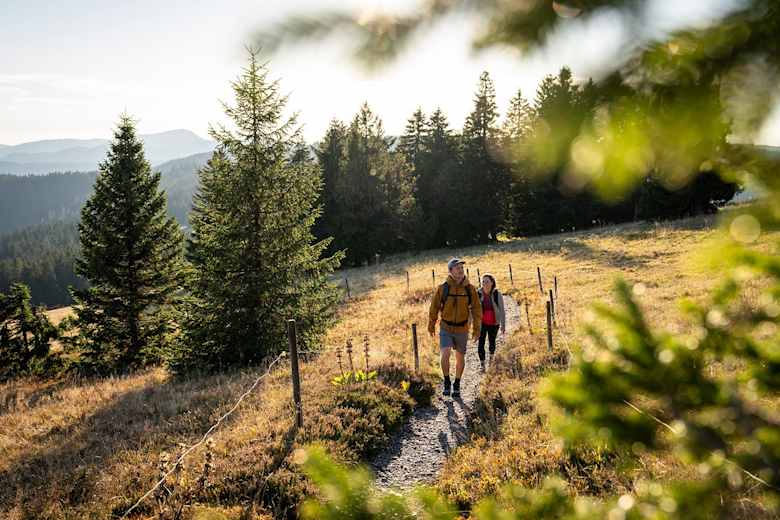 Du beginnst deine Tour in Feldberg-Ort hinter dem Haus der Natur, und es geht gleich „knackig“ bergauf Richtung Panoramaweg. Sobald die ersten Höhenmeter überwunden sind, wirst du bei guter Witterung mit einer atemberaubenden Fernsicht auf die Vogesen im Westen und die Schweizer Alpen im Süden für die Aufstiegsmühe belohnt.