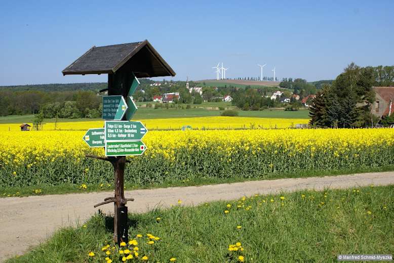 Vom Bahnhof in Oberoderwitz-Oberdorf wandern wir auf einem Teilstück des Oberlausitzer Bergweges, der mit einem blauen Strich markiert ist. Zunächst halten wir uns links und laufen am Bahndamm entlang in Richtung Südosten. An einem Wegweiser geht es nach links und durch eine Bahnunterführung hindurch zu den Sorgeteichen (Infotafel), die einst eine Garnbleiche in Oberoderwitz mit Wasser versorgten. In der Siedlung Neumittelleutersdorf, die wir wenig später durchqueren, befand sich einst die Sorgeschenke, die im 18. Jh. Stützpunkt einiger Räuber- und Schmugglerbanden war; am berühmtesten war die des Räuberhauptmanns Karasek. Hinter den letzten Häusern geht es am Naturdenkmal Richterberg vorbei und über Josephsdorf bis nach Folge. Hier biegen wir zunächst links und wenig später an einem Wegweiser dann rechts ab. Entlang einer Hecke wandern wir am Fuß des Großen Stein, überqueren einen Holzsteg und nehmen an einem weiteren Wegweiser den linken Weg. Quer über eine Wiese steigen wir zum Waldrand hinauf. An einem Rastplatz haben wir eine schöne Aussicht in Richtung Nordwesten. Bald darauf erreichen wir den Fuß des Doppelfelsgipfels des Großen Stein. Der rechte Gipfelfels trägt den Namen Goethekopf, da seine Silhouette an das Gesichtsprofil des Dichters erinnert. Beide Felsen sind im Rahmen eines kurzen Abstechers leicht zu besteigen und bieten eine schöne Rundumsicht. Wir kehren zurück zum Hauptweg, wenden uns dort nach links und wandern ostwärts über freie Felder. Nach 700 m stoßen wir auf eine Landstraße. Wir überqueren sie und erreichen nach wenigen Minuten – nun einer Gelbstrich-Markierung folgend – Spitzkunnersdorf.