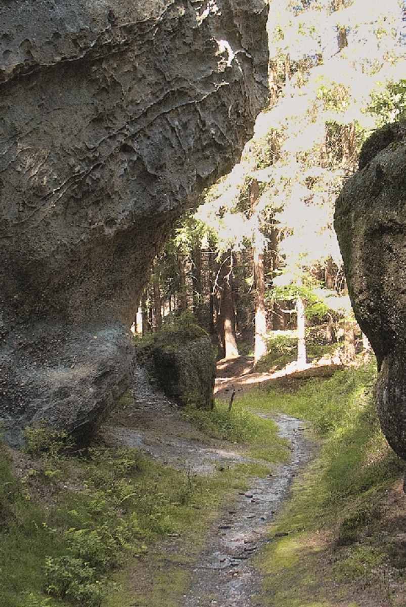 Zurück auf dem Sattel setzen wir unsere Wanderung auf dem mit blauem Strich markierten Wanderweg fort. Nach zehn Minuten erreichen wir einen weiteren markanten Felsen, den Podkova skála oder Hufeisenstein, der seinen Namen den hufeisenförmigen Vertiefungen im Gestein verdankt. Hier biegen wir rechts ab, die Markierung ist an dieser Stelle schlecht zu sehen. Nach 600 m kommen wir an eine große Wegkreuzung. Hier biegen wir erneut rechts ab, nun einer Grünstrich-Markierung folgend. Sie bringt uns zuerst auf einer Forststraße in fünf Minuten hinunter zur Grenze im Weißbachtal und später auf einem schmalen Pfad an mehreren interessanten Felsen vorbei zur Felsformation Böhmisches Tor, Česká brána, durch die in alten Zeiten eine Landstraße von Böhmen in die Lausitz führte; die heutige Verbindungsstraße passiert das nahe Lückendorf und Petersdorf (Petrovice). Wenige Schritte hinter dem Böhmischen Tor biegen wir an einem Wegweiser links in einen mit gelbem Punkt markierten Weg ein, den Steinigten Weg, der uns in einer halben Stunde zum Forsthaus Lückendorf, unserem Ausgangspunkt, zurückbringt.