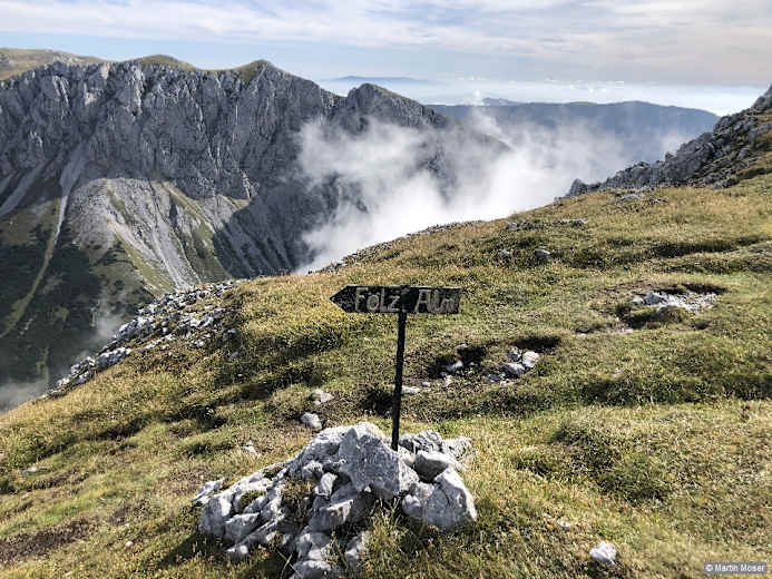 Klettersteig auf den aussichtsreichen Großen Feistringstein, 1.836 m – Vom Zlackensattel rechts Markierungen zum ausgesetzten Klettersteig (Schwierigkeit B) folgen, Klettersteigset und Helm empfohlen.