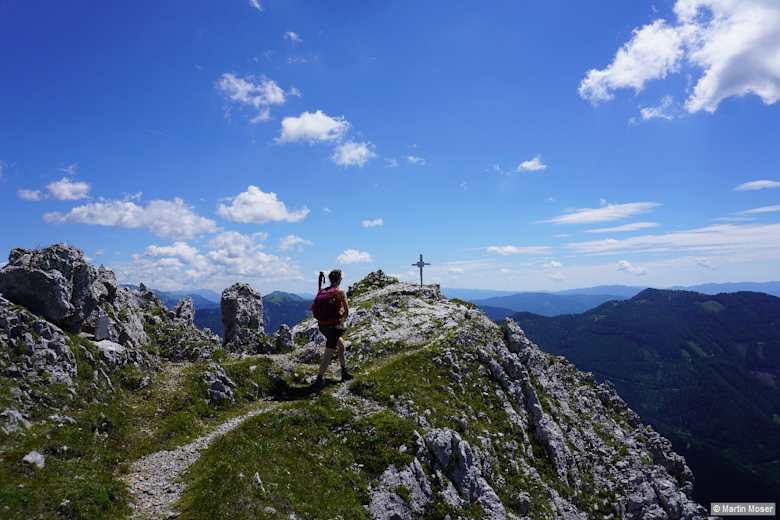 Wir halten uns rechts und folgen dem Weg in Richtung Zlackensattel (Nr. 865), der uns unterhalb des Feistringsteins langsam westwärts führt. Derweil bestaunen wir halb links von uns die sich aufbäumenden Felsgebilde unterhalb des Höchsteins. Noch vor dem eigentlichen Zlackensattel halten wir uns an die linke Wegführung, begehen eine Latschengasse und landen auf einer mit Edelweiß übersäten Wiese. Das kleine Gipfelkreuz des Höchsteins ist nur mehr ein paar Schritte entfernt, die Schatulle mit dem Gipfelbuch ist am Felsen einige Meter vor dem Kreuz montiert. Der Blick auf die umliegenden Berge fällt fantastisch aus.