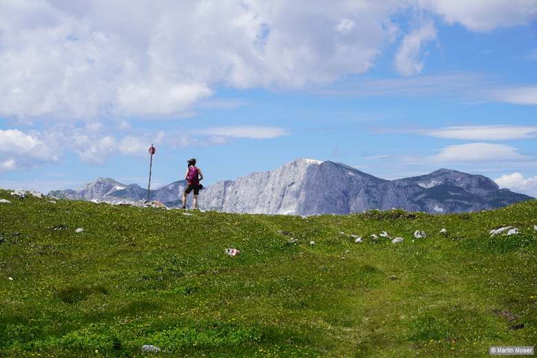 Vorbei an einer Unterstandshütte beschreiten wir das Gebiet der Mitteralm. Ausgetrampelte Pfade und Stangenmarkierungen führen uns über die Hochfläche hinweg und mit einem Schlenker über den Kampl, ehe sich langsam die Hochschwab-Südwand imposant vor uns aufbaut. Beinahe noch spektakulärer fällt der Blick aus, wenn wir die Geländekante überwinden und sich ein weites Wiesen- und Felsenmeer vor uns ausbreitet.