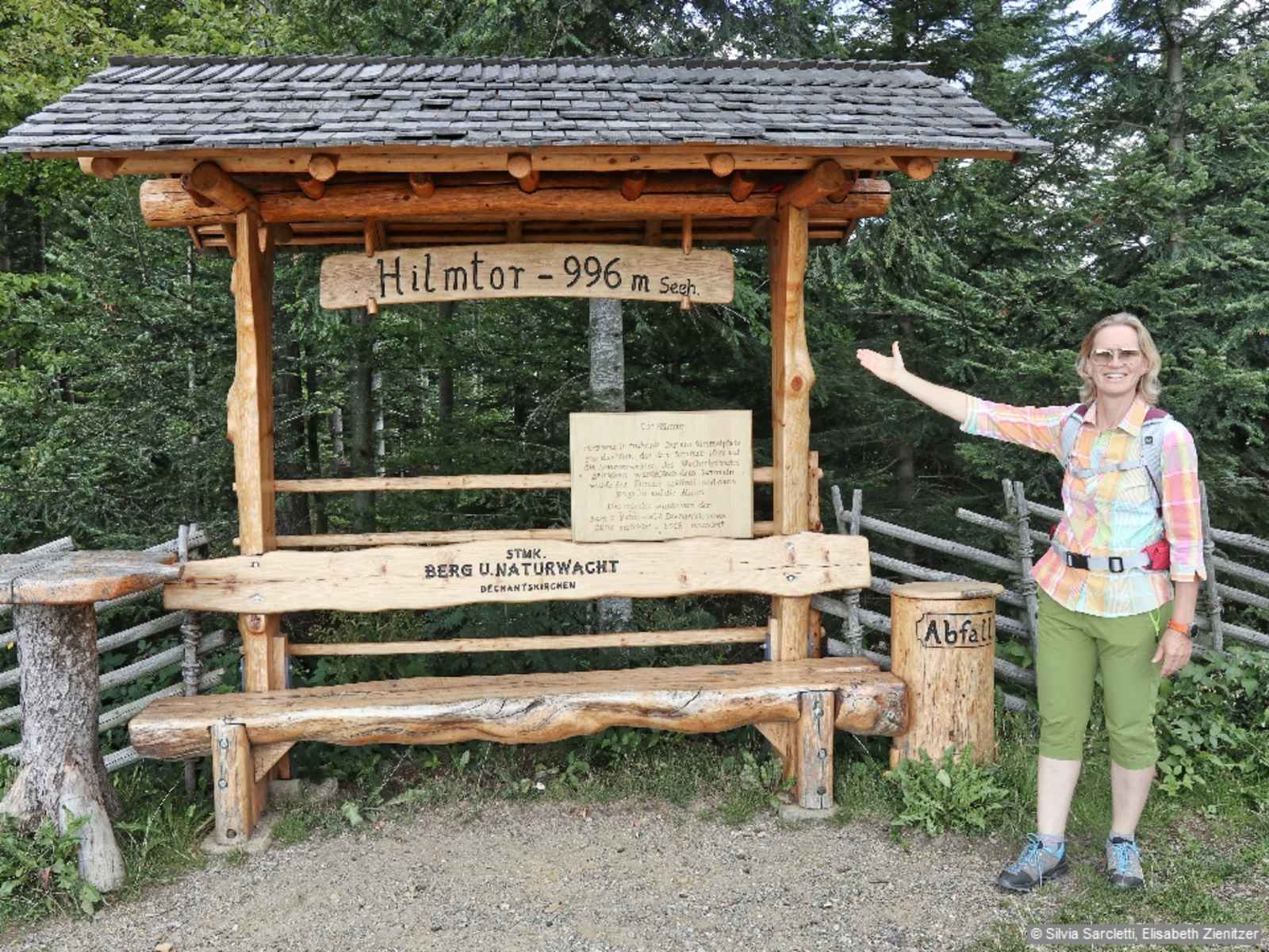 Ein Stück etwas steiler bergauf, bis es dann am Wiesenrand gemütlich weitergeht. Bei einer Baumgruppe sehen wir die rot-weiß-rote Markierung und wandern nun links über die Wiese bis nach Schwaighof, 760 m. Durch die Ortschaft leicht bergauf, bei der Kirche nach links und weiter eben dahin bis zur Kreuzung bei der SAM-Station HF 4716. Hier biegen wir rechts ab und gehen die Straße bergauf, bis wir, noch im besiedelten Gebiet, zu einer Wanderwegkreuzung kommen. Geradeaus weiter (Weg 927) am Panoramastüberl vorbei, bis zum Ortende von Schwaighof. Ein Stück noch die Straße bergauf, bis links der Wanderweg auf einem Feldweg weitergeführt wird. Vorerst eben dahin, dann zweigen wir rechts ab und folgen Pfaden und Forstwegen kontinuierlich bergauf, bis wir einen Bauernhof erreichen. Gemütlich geht es auf der Asphaltstraße zunächst bergauf und in der Folge eben dahin bis zum Hilmtor, 982 m.