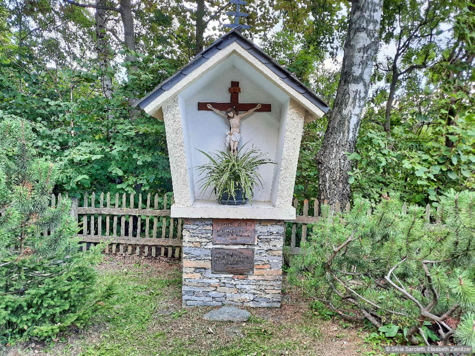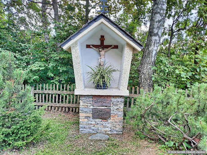 Nach rechts in Richtung Wagnerkreuz durch den Wald bis zu einem Haus. Ab nun sind wir auf einer Asphaltstraße unterwegs, die über Wiesenflächen und Wälder leicht bergab bis zu einer Kreuzung, 904 m, führt (Wagnerkreuz/Schwaighof). Nun verlassen wir die Asphaltstraße und wandern links in Richtung Wagnerkreuz weiter, bis wir ein paar Häuser erreichen. Bei der Straßenkreuzung geht es nun nach rechts unten, und nach ca. 200 m wandern wir links über die Wiese; in der Ferne sehen wir die rot-weiß-roten Markierungen an den Bäumen. Der Abstieg führt über die Wiese am Rücken entlang, vorbei am Bartl-Kreuz, 840 m, bis wir auf die Straßenkreuzung mit dem Wagnerkreuz, 785 m, treffen.