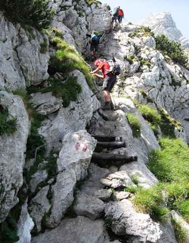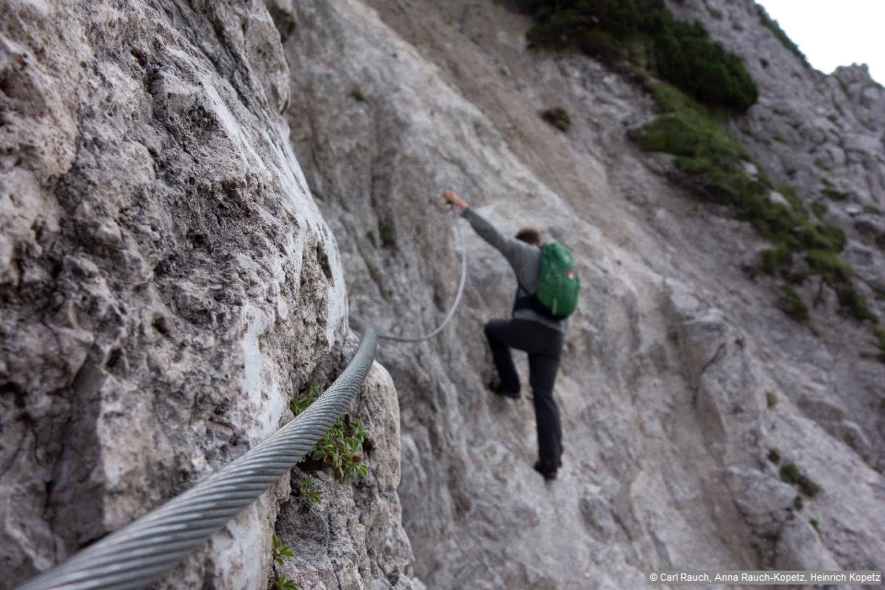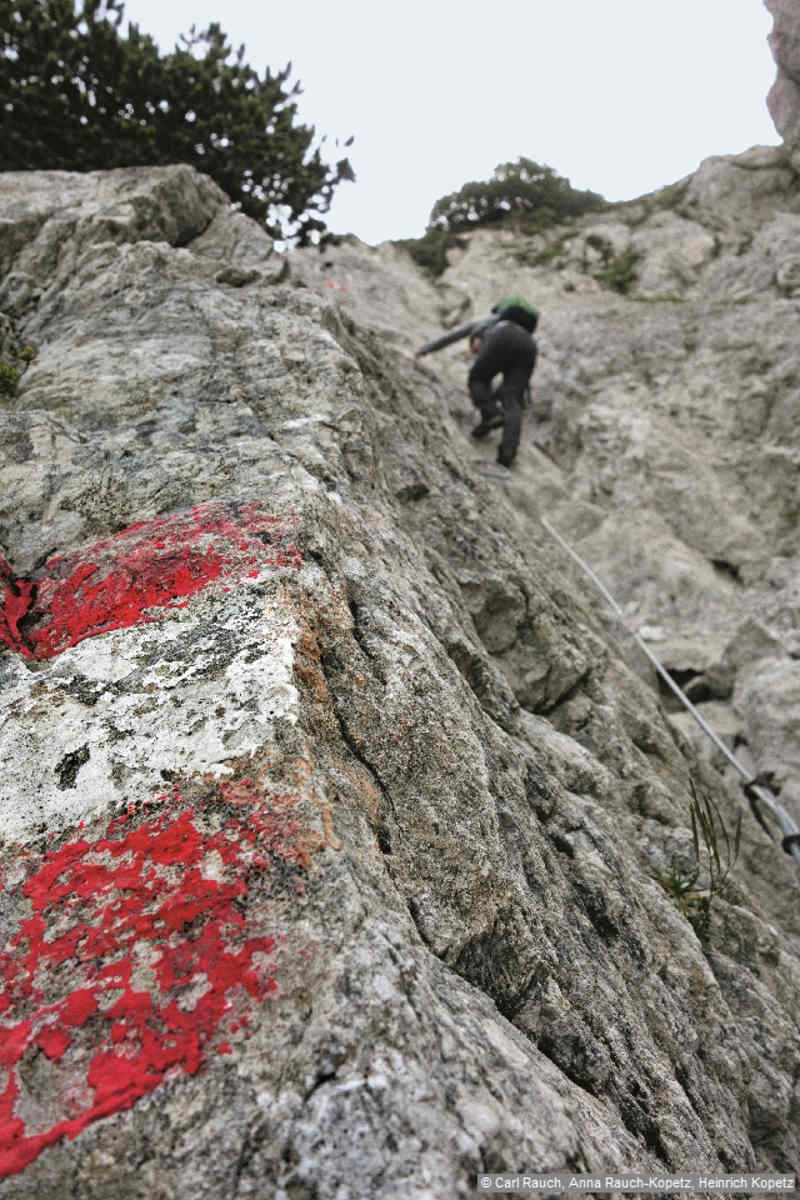 Alpine Steige, Klettersteig-Stellen (B), Steinschlaghelm und Klettersteigset empfohlen, Trittsicherheit und Schwindelfreiheit erforderlich.
