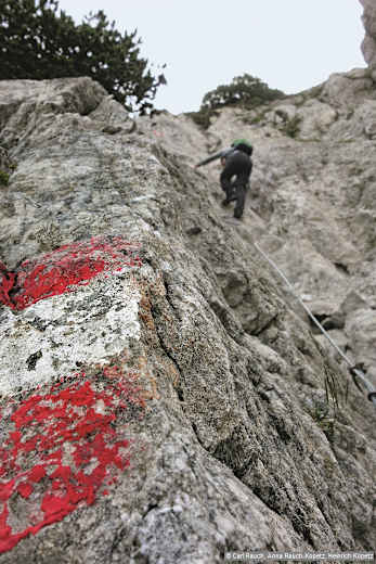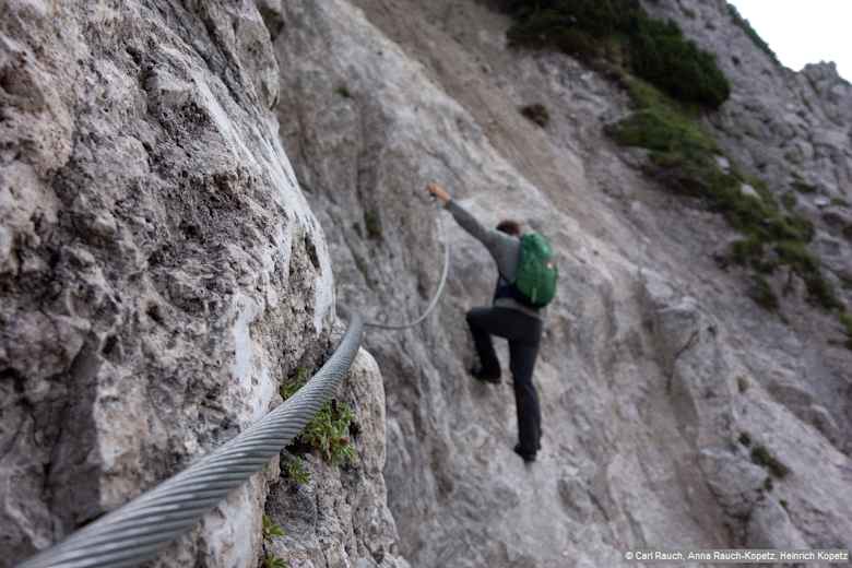 Der Klettersteig ist gut mit Stahlseilen gesichert, aber nicht immer einfach zu gehen. Foto: Carl Rauch, Anna Rauch-Kopetz, Heinrich Kopetz, Bergverlag Rother GmbH