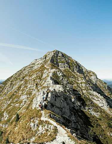 Direkt vor dem Admonter Haus, 1.725 m, biegen wir rechts ab Richtung Jungfernsteig. Zuerst quert ein Weg den Berghang, zunehmend geht der Pfad in den Klettersteig (Schwierigkeit B) durch die Jungfernscharte über. Nach dem Ende der Stahlseilversicherungen ist es zum Gipfel des Grabnersteins, 1847 m, nicht mehr weit.