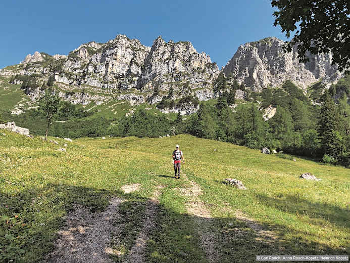 Vom Gipfel folgen wir einem gut angelegten Weg, je nach Jahreszeit vorbei an üppigen Blumenwiesen, zum Grabneralmhaus, 1.391 m. In südwestlicher Richtung gleich unter der Hütte kreuzen sich zwei Schotterstraßen. Wir wählen die leicht ansteigende Straße, halten uns bei Abzweigungen zweimal rechts und erreichen bald die umzäunte Forchneralm. Der Durchgang ist erlaubt, die Gatter sind aber jeweils wieder sorgfältig zu schließen. Wir folgen dem zunehmend verwachsenen Weg bis zum Rabengrabenbach, den wir queren, um bei der Abzweigung zum Forchneralm wieder auf den Aufstiegsweg zu treffen.