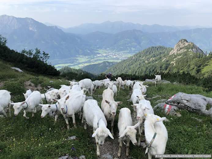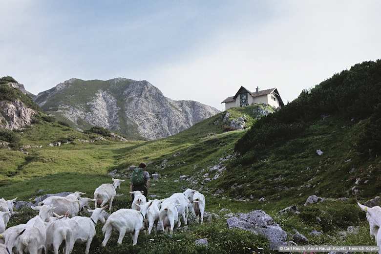 Begleitet von den Ziegen der Grabneralm auf den letzten Metern vor dem Admonter Haus. Foto: Carl Rauch, Anna Rauch-Kopetz, Heinrich Kopetz, Bergverlag Rother GmbH