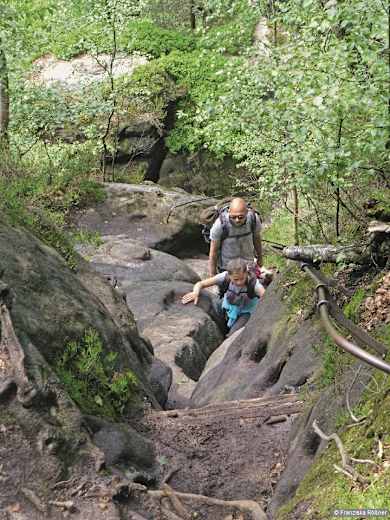 Gegenüber vom Parkplatz Holzlagerplatz nehmen wir die Forststraße in den Nationalpark hinein. Nach etwa 300 m biegen wir an einer Sandsteinmauer nach links durch das Aspenbloß zur Breiten Kluft ab. Als Bloße (oder auch Huschen) wurden Gleitbahnen bezeichnet, in denen geschlagenes Holz durch seine eigene Schwerkraft angetrieben die Abhänge herunterrutschen konnte. Der einst aufwändig angelegte Waldsteig, der ursprünglich von Holzfällern und Steinbrechern genutzt wurde, führt steil im Grund aufwärts. Im ersten Teil des Aufstiegs dominiert Mischwald mit teils hohen, alten Buchen. Nach einer felsigen Engstelle weitet sich der Grund und wir gelangen zu einem hohen Fichtenwald, dessen Bäume am Absterben sind. Wenig später stoßen wir auf einen breiten, mit grünem Punkt markierten Wanderweg, den Elbleitenweg. Auf diesem wandern wir nun gemütlich nach rechts weiter. Wir passieren den hohen Rauschenstein. Einst trug er eine Burgwarte, heute ist er ein beliebter Kletterfelsen. Nach einer Viertelstunde führt der Fahrweg talwärts zu einer scharfen Rechtskurve. Genau an dieser Stelle verlassen wir den Fahrweg geradeaus und folgen dem mit grünem Pfeil gekennzeichneten Bergpfad zur Rotkehlchenstiege. Über sandige Holzbohlen, später auch hölzerne Stufen geht es zu einer kurzen Felsenstiege mit einigen Eisenklammern als Griffhilfe. Darüber halten wir uns links, immer den grünen Pfeilen nach. Am linken Rand eines hohen, hellen Felsüberhanges mit reichlich tiefem Sand darunter steigen wir über Holzstufen und eine steile, ausgetretene Felstreppe mit Eisenklammern bis ganz auf die Felsen hinauf und halten uns oben wieder links. Ein sandiger Weg bringt uns in den Wald hinein, wo wir gleich darauf auf einen Hauptwanderweg treffen. Der Wegmarkierung „blauer Strich“ folgen wir nach rechts. Bereits nach 300 m steigen wir nach rechts Richtung „Großer Winterberg“ auf. Der Zurückesteig bringt uns über Stufen und Treppen auf ein Felsenriff hinauf. Die Schlangenwurzel am Ende der Treppe, der gelbliche Kelchstein und ein schöner Ausblick hinüber zum böhmischen Elbtal begeistern auf diesem malerischen Teilstück. Nach einem mit einer Kette gesicherten Wegstück stoßen wir auf eine Wegkreuzung. Wir wechseln auf die Markierung gelber Strich nach links in Richtung Kleiner Dom. Unterwegs passieren wir das Kleine Prebischtor, ein romantischer Felsbogen. Nach 20 Min. biegt der markierte Weg scharf rechts hinunter ab. An dieser Stelle kann man geradeaus zur wundervollen Domerkeraussicht weitergehen. Anschließend steigen wir mit der gelben Markierung in den Kleinen Dom hinunter. Es ist eine romantische Stiege mit Holzstufen nah an einer senkrechten Felswand entlang. Im Tal wandern wir auf einem bequemen Wanderweg zusammen mit der Markierung grüner Punkt Richtung Schrammsteine weiter.