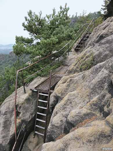 Nach einer knappen halben Stunde verlassen wir die gelbe Markierung und steigen mit dem grünen Punkt über den Mittelwinkel in Richtung Schrammsteinaussicht aufwärts. Nach endlos erscheinenden Holzstufen klettern wir in einem Felswinkel auf langen senkrechten Leitern hinauf auf den Schrammstein-Gratweg. Auf diesem sehr schönen Weg erreichen wir einige Minuten später die gern besuchte Schrammsteinaussicht, die einen einzigartigen Panoramablick über die Sächsische Schweiz, auf die zerklüfteten Schrammsteinfelsen, die linkselbigen Tafelberge und ins tiefe Elbtal freigibt. Rechts im Tal steht völlig isoliert der Falkenstein, der im frühen Mittelalter eine Burgwarte trug.