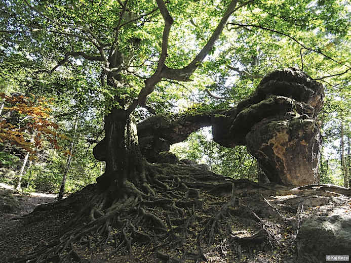 Zwei Naturwunder – Wurzeln einer alten Buche und das »Kleine Prebischtor«.Foto: Kaj Kinzel, Bergverlag Rother GmbH