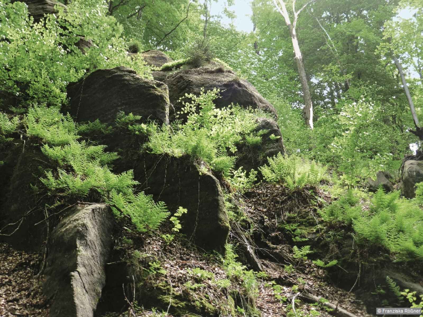Vom Bahnhof Hirschmühle setzen wir mit der Fähre nach Schmilka über. Vom Fähranleger gehen wir zur Hauptstraße hinauf, überqueren diese und wandern geradeaus weiter in den malerischen Ort hinein. Vorbei an einem alten Umgebindehaus und durch die historische „Schmilk’sche Mühle“ mit seiner Mühlen-Bio-Bäckerei gelangen wir auf der steilen Straße zur Nationalpark-Infostelle am oberen Ortsende. Wir biegen rechts ab und folgen dem grün markierten Bergsteig in Richtung Großen Winterberg. Der Wanderweg führt im Wald sehr steil aufwärts. Bereiche mit abgestorbenen Fichten erfordern etwas Aufmerksamkeit. Zunehmend dominieren jedoch alte hohe Buchen. Weiter oben geht’s über Stufen und Treppen durch eine romantische Felsenpassage. Kurz danach, nach insgesamt etwa einer Stunde, quert eine Forststraße namens „Weiberfähre“. Wir biegen rechts ab, verlassen dazu unsere Markierung, um zur grandiosen, rund 400 m entfernten Kipphornaussicht zu gelangen. Nach dem anstrengenden Aufstieg finden wir an dieser umfassenden Felsenaussicht Gelegenheit für eine Rast. Das weite Panorama reicht vom böhmischen Elbtal zur Linken, über Hoher Schneeberg, mit 722 Meter höchster Gipfel des Elbsandsteingebirges, Zschirnsteine, Zirkelstein und Kaiserkrone gegenüber, bis zu den sächsischen Tafelbergen und den Schrammsteinen zur Rechten. Von der Aussicht gehen wir auf demselben Weg zurück, können uns nach 5 Min. auf der Forststraße gleich weiter aufwärts halten und treffen kurz danach wieder die grüne Markierung. Sie bringt uns durch hohen Buchenwald in 10 Min. auf den Gipfel des Großen Winterberges. Vor dem altehrwürdigen Berggasthaus mit Aussichtsturm befindet sich das „Eishaus“, eine Nationalpark-Infostelle. Wir gehen links am Gasthaus vorbei in Richtung „Heringsloch/Felsenmühle“ und folgen auch für den Rest der Wanderung der Markierung grüner Strich. Rechts am Weg entdecken wir tiefschwarze Felsen. Es ist Basalt, der gut an seiner fünf- bis sechskantigen Säulenform zu erkennen ist. Die gesamte Gipfelkuppe wird von Basalttrümmern bedeckt. Deren Verwitterungsböden lassen am Winterberg den reichen Buchenwald gedeihen, in dessen Krautschicht im zeitigen Frühjahr beispielsweise Buschwindröschen und Hohler Lerchensporn, später Frühlingsblatterbse und Waldmeister, im Sommer unter einem schattigen Blätterdach Springkraut zu finden sind. Gemütlich steigen wir abwärts. An der nächsten Kreuzung treffen wir auf die neu errichtete Wegsäule des alten Fremdenweges. Wir biegen rechts ab, um gleich darauf Richtung „Queenwiesen“ nach links ins Heringsloch abzusteigen. In Wanderkarten findet man auch die Bezeichnungen „Quenenwiesen“ und „Queenengrund“. Die Ortsbezeichnung geht auf einen Eintrag im Hohnsteiner Amtserbbuch des Jahres 1547 zurück, in welchem „ein reumicht In der queyn“ erwähnt wurde. Gemeint war damit eine urbar gemachte Fläche im Wald. Auf einer Karte von 1592, die während der mehrere Jahrzehnte dauernden Ersten Kursächsischen Landesaufnahme erstellt wurde, hielt der Landesvermesser Oeder den Wiesengrund im heutigen Kleinen Zschand bereits als „quene“ fest.