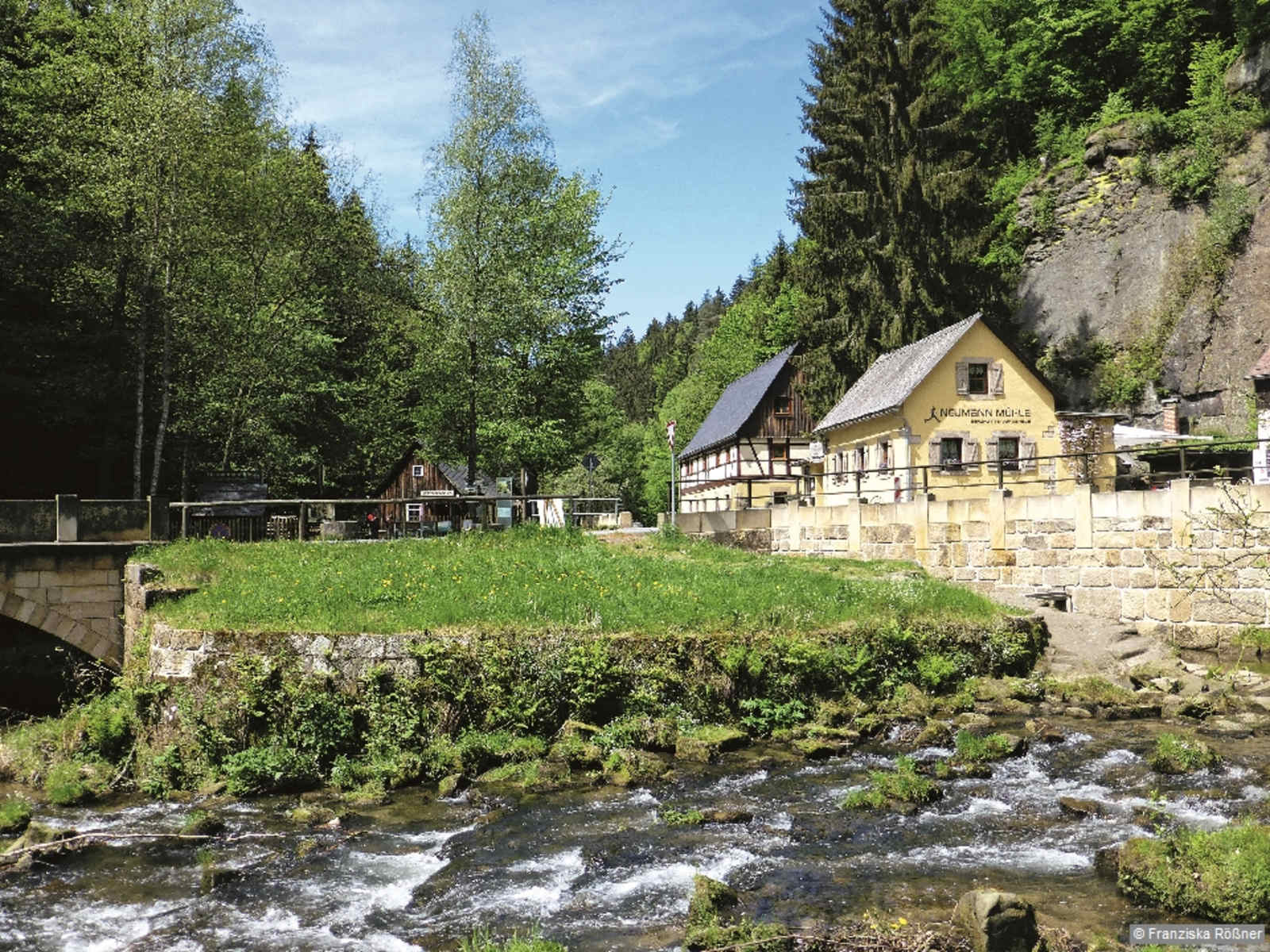 Nach wenigen Schritten kommen wir in einen wilden Felsengrund. Mit Moosen und Farnen bewachsene Felsen säumen den Abstieg. Bald darauf kreuzen wir den Königsweg und steigen weiter abwärts. Durch ein kleines Felsentälchen mit einem temporären Bächlein erreichen wir bald die feuchten Quenenwiesen. Auf einer Forststraße wandern wir durch das noch tiefer eingeschnittene Felsental Kleiner Zschand in einer halben Stunde ins Kirnitzschtal, wo man im Gasthaus Felsenmühle einkehren kann. Das letzte Stück unserer Wanderung verläuft auf dem Flößersteig, der das heutige Sägewerk Felsenmühle oberhalb umgeht. Bereits 60 m vor der Kirnitzschbrücke führen ein paar Stufen nach rechts hinauf in Richtung Neumannmühle, die wir nach einer Viertelstunde erreichen. Gegenüber dem Gasthaus Neumannmühle können wir uns die älteste Säge- und Holzschliffmühle des Kirnitzschtals ansehen und in der Schauanlage einiges über die Holzschleiferei und die Papierherstellung erfahren.