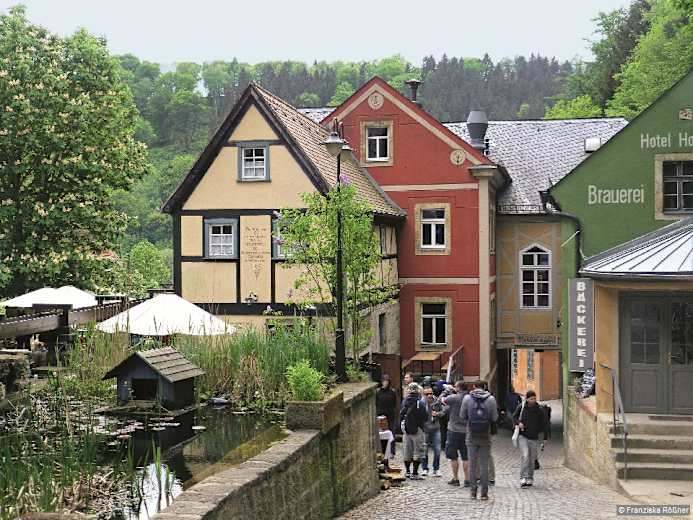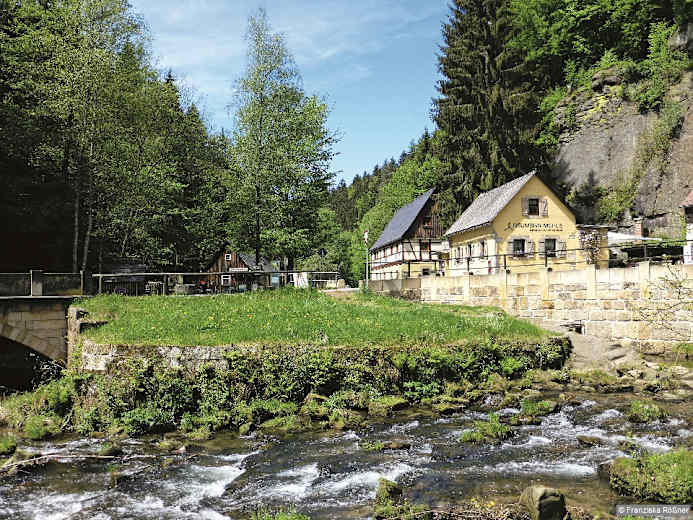 An der Schmilk'schen Mühle ist bereits einiges los. Foto: Kaj Kinzel, Bergverlag Rother GmbH Ein Loch im Blätterdach lässt die Bodenflora sprießen. Foto: Kaj Kinzel, Bergverlag Rother GmbH Die Neumannmühle im Kirnitzschtal – eine beliebte Einkehr nach der Wandertour. Foto: Kaj Kinzel, Bergverlag Rother GmbH Bildergalerie (3)