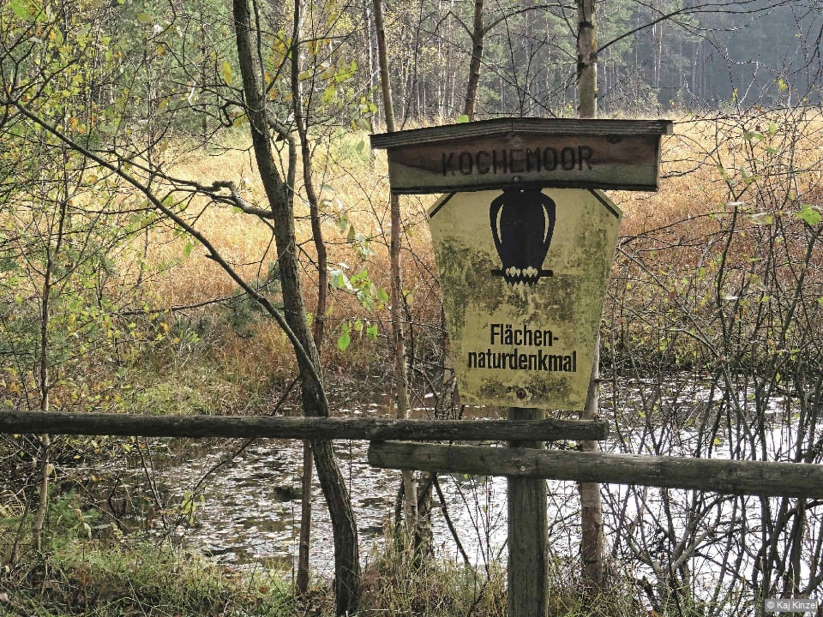Unweit des Zeisigsteins befindet sich ein breiter Forstweg mit Wegweiser, Sitzbank und Schutzhütte. Wir folgen dem Forstweg 100 m nach links, dann zweigen wir mit den Forststeigzeichen nach rechts auf einen wilderen Pfad ab. Nach etwa 10 Min. gelangen wir an einen Wegweiser. Man kann einen Abstecher zum 200 m entfernten Hartenstein, einer einsamen Aussichtskanzel unternehmen, die nochmal einen Blick auf das Osterzgebirge und über das Bahratal Richtung Elbtal und Dresdner Fernsehturm freigibt. Wieder zurück am Abzweig treffen wir schon wenige Schritte später auf eine Weggabelung und halten uns mit den Markierungen links. Es geht deutlich abwärts. Nach 300 m besteht die Möglichkeit, die Wanderung abzukürzen und nach Hellendorf abzusteigen (siehe Variante). Wir wandern jedoch rechts auf einem Waldweg weiter, wo wir mal kurz über die Wiesen nach Markersbach schauen können. Für einen Kilometer gehen wir durch ein abwechslungsreiches Waldgebiet, bis wir auf ein größeres Wegdreieck treffen, wo der Forststeig rechts weiterführt. Geradezu im Wald lässt sich bereits das Flächennaturdenkmal Kochemoor ausmachen. Die Senke ist fast komplett mit Gräsern bewachsen. Man kann vom Wegedreieck aus geradeaus durch einen Fichtenforst zum nördlichen Ende des Moorteiches gelangen (2 Min.). Der unmarkierte Waldweg führt unweit eines Jägerhochsitzes vorbei, von dem aus die Vogelwelt über dem mit Pfeifengras, Binsen und Braun-Seggen bewachsenen Feuchtbiotop beobachtet werden kann. An einigen Stellen ist sogar Wollgras zu sehen. Vielleicht treffen wir auf Libellen oder einen Grasfrosch. In einer kleinen Wasserfläche am Nordende kann man die für Moore so typischen Torfmoose im klaren Wasser entdecken. Nachdem wir zum Wegdreieck zurückgekehrt sind, folgen wir dem Forststeig weiter.