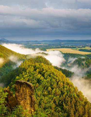 In der Tyssaer Felsenstadt, einem überregional bekannten Naturdenkmal im böhmischen Elbsandsteingebirge, bilden auf engstem Raum über 80 Sandsteinfelsen ein faszinierendes Felsenlabyrinth. Die bizarr geformten, sagenumwobenen Felstürme regten von je her die Fantasie der Besucher an und tragen heute bildhafte Namen wie Mumie, Hagerer Doktor, Afrikaturm oder Elefant. Auf dem einstündigen Rundweg erkunden wir Höhlen, Gänge und Durchschlüpfe. Von den ausgesetzten, senkrecht abfallenden Südwänden reicht der Panoramablick vom bewaldeten Osterzgebirge bis zu den rundlichen Basaltkuppen des Böhmischen Mittelgebirges.