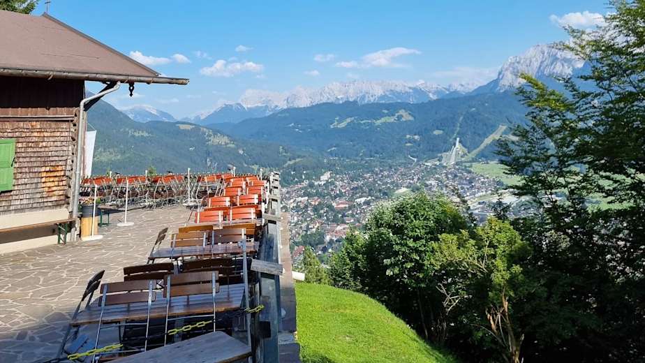 Nach ca. 10 Min. erreichst du eine Lichtung mit der Kriegergedächtniskapelle. Hier wendest du dich rechts und folgst dem Forstweg bergauf zur St. Martin-Hütte. Die Beschilderung hilft dir den richtigen Weg einzuschlagen. An der St.-Martins-Hütte angekommen, kannst du den Blick auf Garmisch-Partenkirchen bei einer Hütteneinkehr genießen.