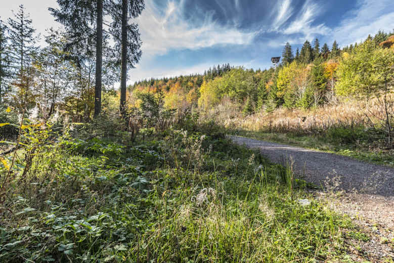 Vom Parkplatz „Im Wolfsgrund“ gehst du durch die Unterführung der B500, folgst dem Wanderweg nach links und überquerst die L156 nach Lenzkirch. Nach der Kreuzung folgst du dem Wander- und Radweg entlang der B500. Nach wenigen Metern siehst du das Einstiegsportal des Schluchseer Jägersteigs.
