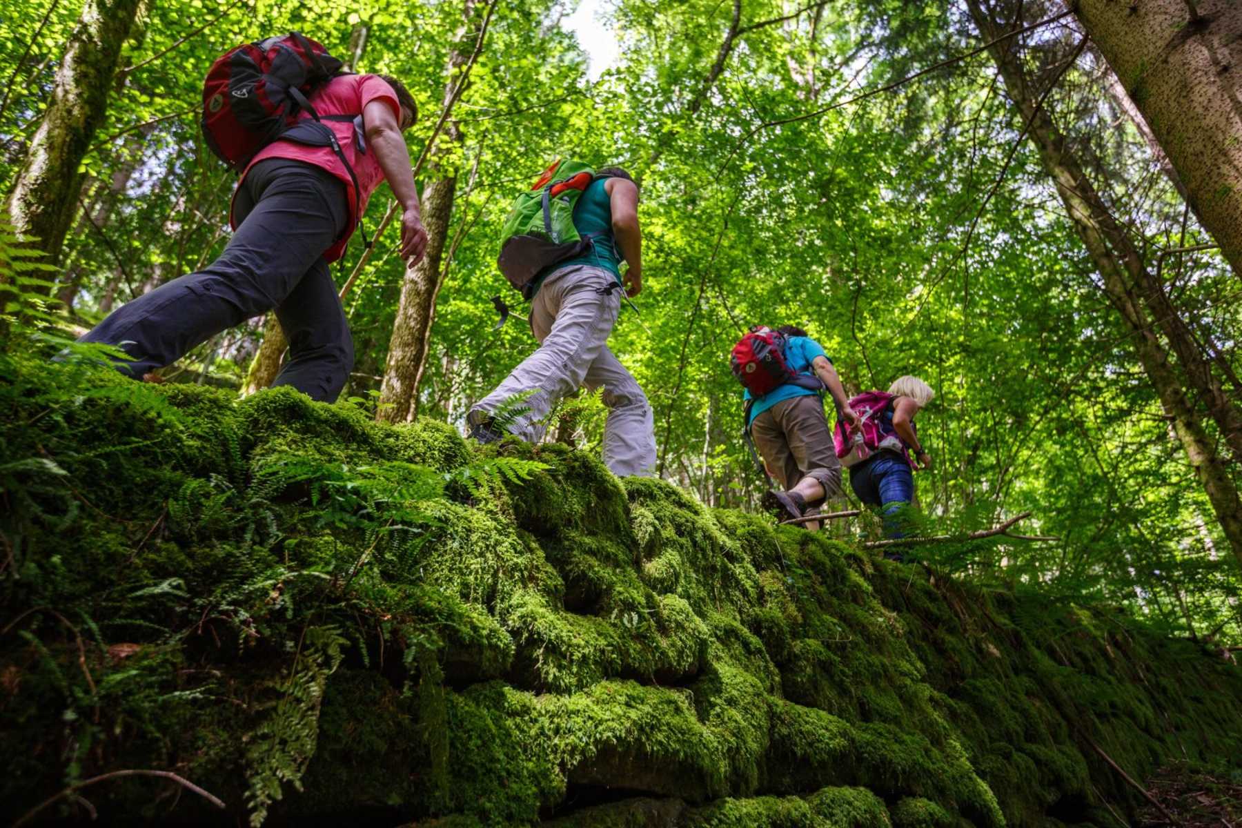 Unser Blick wandert über einen Bauernhof zur gegenüberliegenden Talseite des kleinen Holchentals, wo wir erst vor kurzem gewesen sind. Abenteuerlich schlängelt sich nun ein Pfad inmitten von Felsen weiter bergauf, mündet in einen Forstweg. Kurz später fühlen wir uns dann schon wieder wie Pfadfinder. Rechts ab geht’s einfach mitten durch den Wald. Peu à peu verlieren wir an Höhenmetern.
