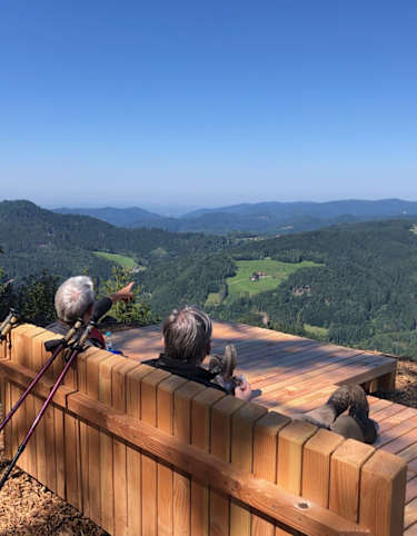 Wer schnell aus der Puste kommt, freut sich nach einem Kilometer über die erste Himmelsliege. Beim Weiterwandern erhaschen wir Blicke auf steile Schwarzwaldberge. Dann ist der Aufstieg geschafft: Nach wenigen Metern Forstweg zweigt ein Pfad rechts ab auf eine Wiese. Hier erwartet uns der weiteste Ausblick: Gen Westen auf die Berge und Täler des Renchtals. Top: die 22,5 m lange Himmelsbank.