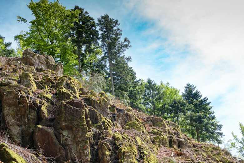 Plötzlich biegt ein ganz schmaler Pfad rechts ab: Über federnden Waldboden wandern wir talwärts, durch ein Buchenwäldchen, passieren den Paradies-Felsen – oder klettern kurz drauf. Rauschen kündigt den Holchenwasserfall an: Mitten im Wald fällt er auf zwei Stufen etwa acht Meter hinunter. Die halbe Wegstrecke liegt hinter uns, 5,3 Kilometer sind geschafft. Im Bach stehen gegen einen Obolus Getränke bereit. Wer nun allerdings eine Rast mit Ausblick wünscht, muss noch einen Kilometer bis zum Himmelsfelsen draufsetzen.