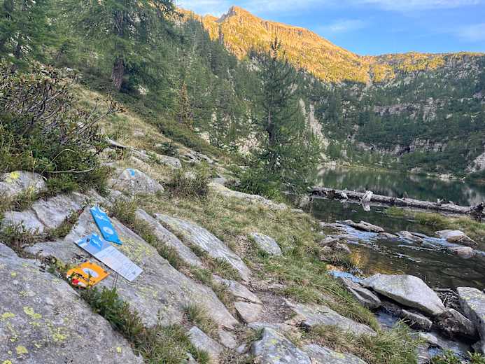 Die Tour startet in Campo Vallemaggia. Zunächst auf Asphalt, dann über einen waldigen Wanderweg (rot-weiss) hinunter nach Pianelli, wo eine Brücke über den Fluss führt. Danach beginnt der Aufstieg zur Alpe di Sfii, die im Sommer von Kühen besetzt ist. Besonders im Herbst verzaubert das goldene Leuchten der Lärchen. Nach einem kurzen Abstieg folgt der Weg hinauf zum Lago di Sfii, malerisch eingebettet in eine grüne Mulde mit kristallklarem Wasser. Weiter geht es nun auf blau-weiss markiertem Weg über alpines Gelände zur Cima del Lago, etwas unterhalb liegt der kleine Larghetto alto del Pèzz. Nach einem aussichtsreichen Abstieg erreicht man den Lago del Pèzz. Von dort führt ein rot-weisser Weg über Corte del Pèzz und die Alpe d’Arnàu durch typische Tessiner Berglandschaft zurück nach Campo. Wer möchte, kann anstatt nach Campo zurückzukehren, bei Francia den Weg hinunter nach Niva nehmen – ein wunderschöner Abschluss der Tour.