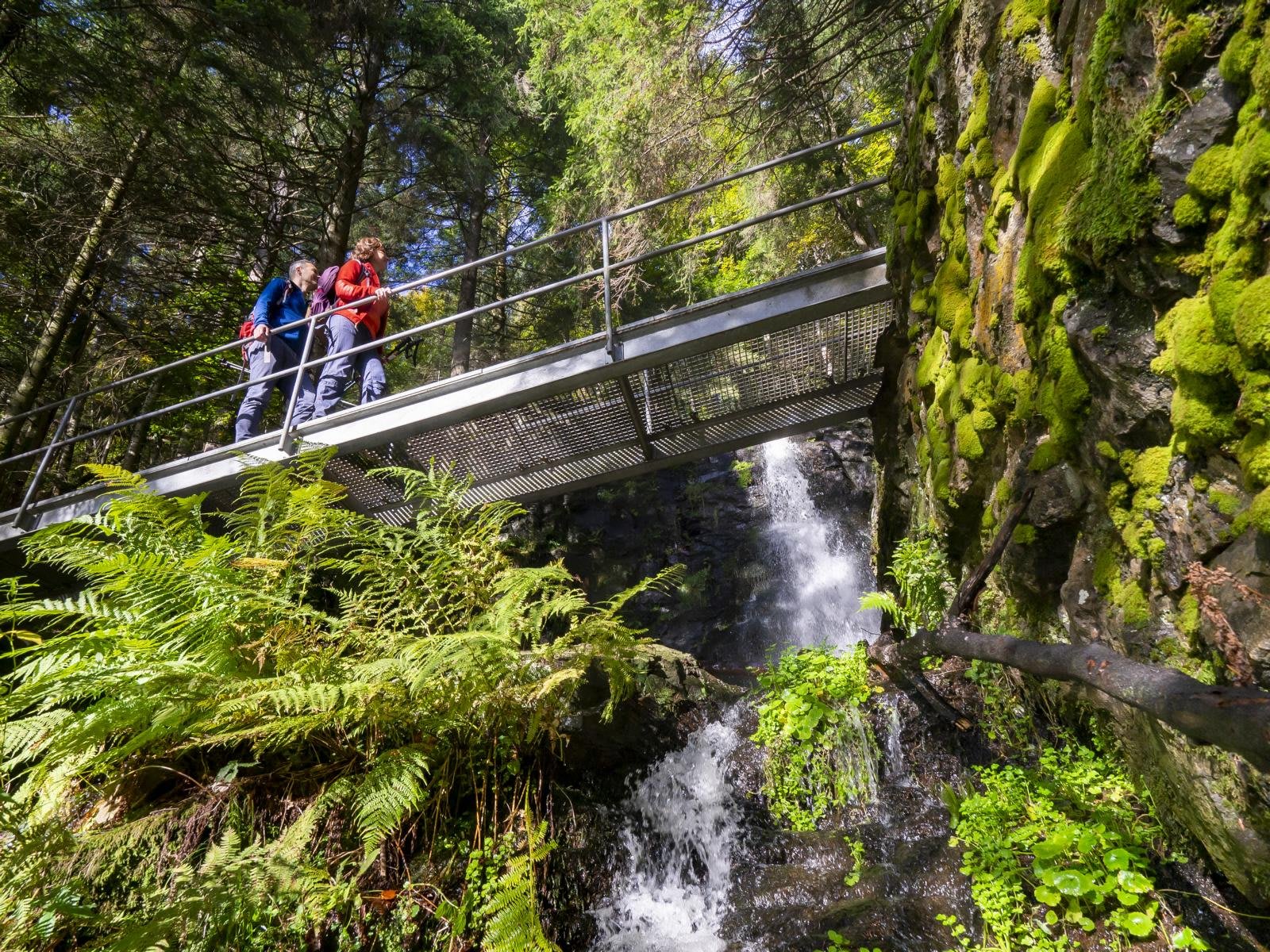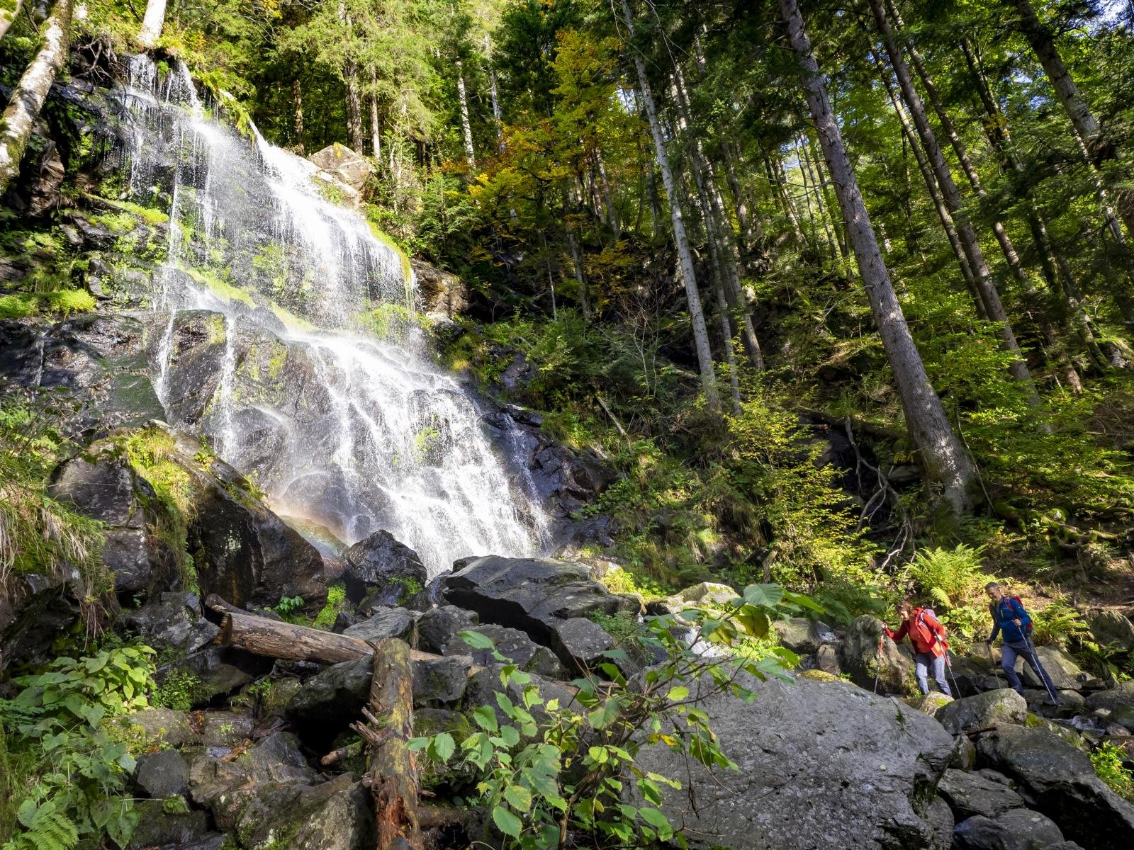 Oberhalb des kleinen, aufgestauten Plattensees entlang erreichst Du den Langeckerhof. Kurz darauf beginnt der steile Abstieg ins Simonswälder Tal. Der Wald wird feuchter, schwärzer – das Rauschen lauter. Endlich: die Zweribach-Wasserfälle. Sprühend, spritzend, donnernd und wild – in zwei großen Absätzen stürzt sich das Wasser zu Tal.