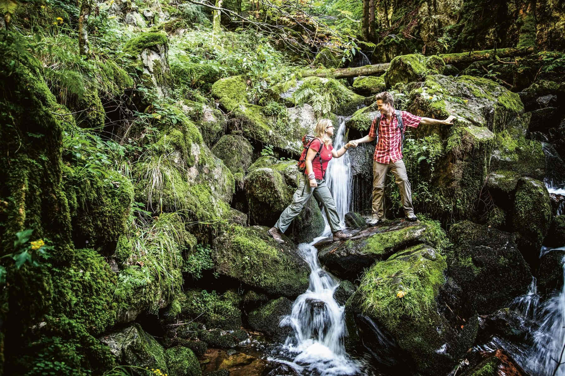 Unbedingt den Abstecher zum Plattenhof einplanen – nach dem beeindruckenden Spektakel der Zweribach-Wasserfälle gibt es auf der Terrasse regionale Schmankerl wie Holzfällersteak, geräucherte Bratwürste und frisch gezapften Kaffee mit herrlichem Blick auf Plattensee und Simonswäldertal