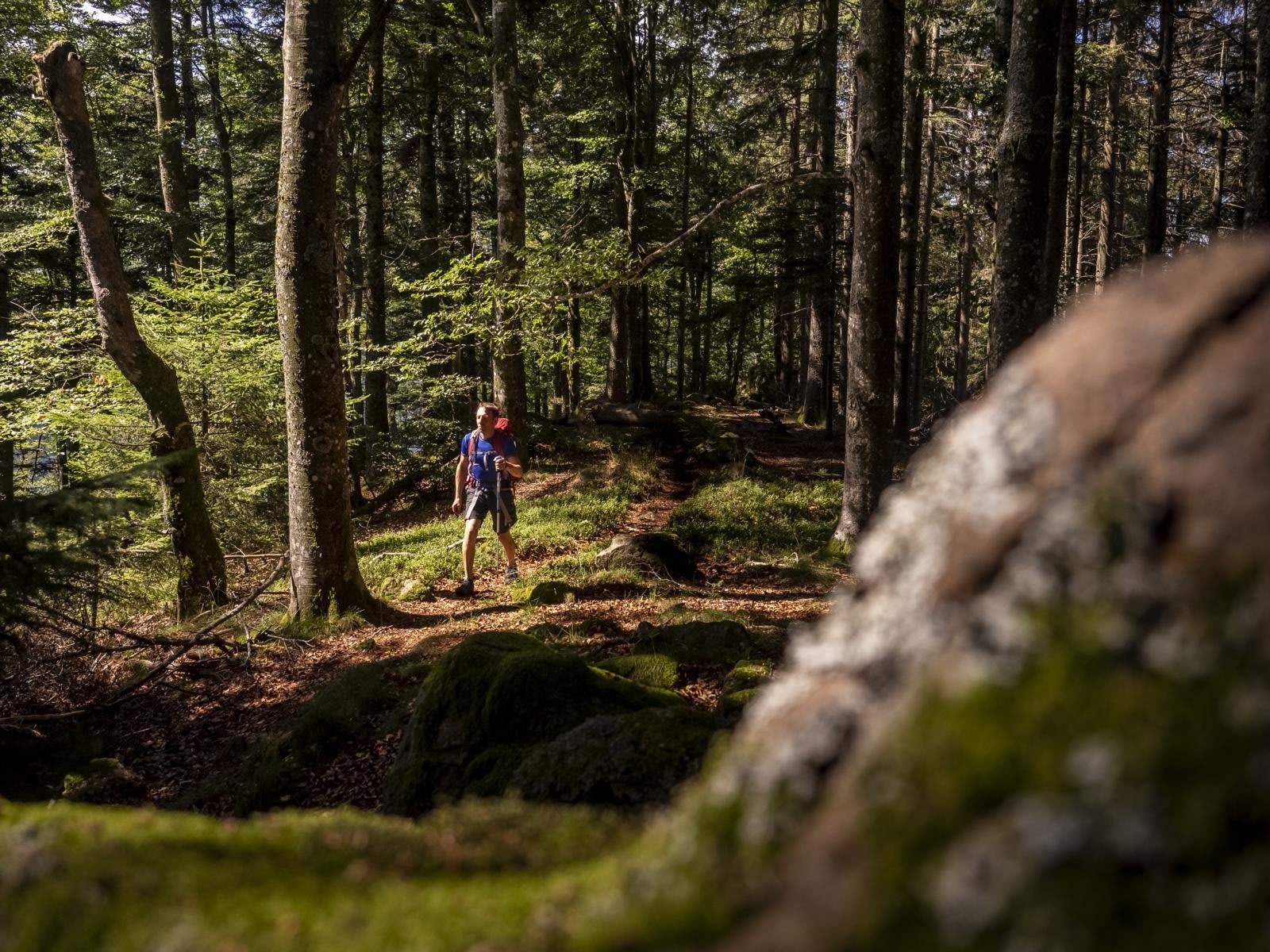 Auf dem Höhenrücken zwischen Hörnleberg und Rohrhardsberg warten stille Pfade, versteckte Felsen wie am Tafelbühl und Braunhörnle, sowie weite Bergwiesen. Bei der Passhöhe Am Schlagbaum erreicht man einen alten Grenzpunkt zwischen Baden und Württemberg, bevor die Route vorbei an Gfels und Gschasifelsen zur aussichtsreichen Kapfhütte führt.. Der steile Abstieg ins Tal fordert nochmal Konzentration.