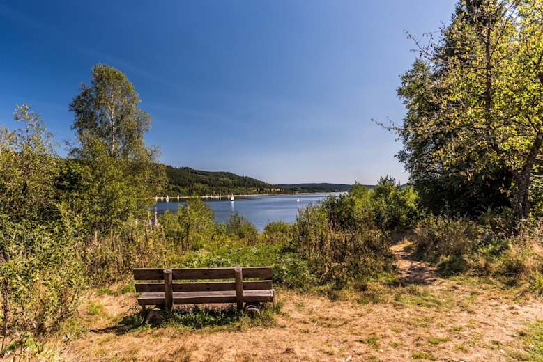 Auf der Höhe oben führt der Weg dann in Richtung Aha-Auerhahn. Über den urigen Pfad gelangt man an einen beachtlichen Aussichtspunkt, den Bildstein (1.134 m). Von dort verläuft der Schluchtensteig rechts abwärts. Kurzerhand ist auch schon der Schluchsee in Sichtweite. Auf schmalem Weg geht es dann weiter bergab durch den herrlichen Wald. Bald gelangt man zur Eisenbahnbrücke, unter der der Weg hindurch führt.