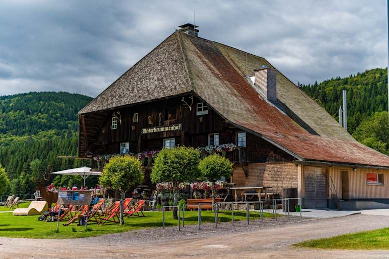 Beim Hotel Auerhahn geht es dann in Richtung Unterführung. Unter der B500 durch, führt der Weg direkt an den See. An den Segelbooten vorbei geht es links auf einen Pfad, der am Schluchsee entlang führt. Am herrlichen Schluchsee-Ufer geht es entlang bis zum Unterkrummenhof. Der historische Hof wird heute als Versperstube betrieben. Kurz vor dem Hof verläuft der Weg in Richtung Wald. Am Wegweiser geht es dann links auf einen Forstweg, der später über eine alte Brücke führt. Diesem Forstweg gilt es weiterhin zu folgen. Durch den Wald geht es zur Krummenkreuz Hütte, die zum Verweilen und Rasten genutzt werden kann.