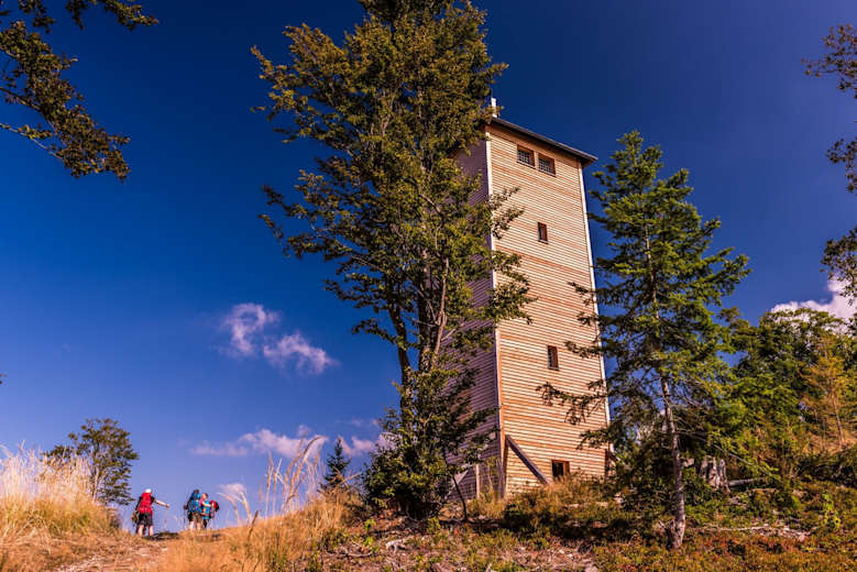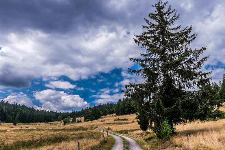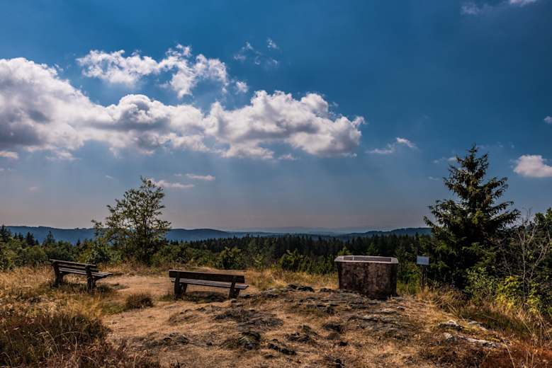 Der Weg führt dann wieder in den Wald hinein und man gelangt über einen Forstweg an eine Straße. An dieser geht es links und dann wieder rechts an einem Parkplatz vorbei. Hier folgt ein Panoramaweg, der hinauf zum Aussichtspunkt Lampenschweine führt. Von hier geht es weiter durch Weiden am Waldrand entlang und an einer Schutzhütte vorbei. Diesem Weg folgend erreicht man das Gipfelkreuz am Schluchtensteig. Eine tolle Aussicht über die weite Landschaft lässt sich bestaunen.