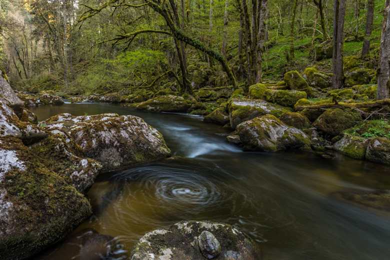 Dort überquert man die Straße, die nach Dachsberg führt, und gelangt bald an einen idyllischen Aussichtspunkt über der Teufelsküche. An diesem eindrucksvollen Naturschauspiel sollte eine Rast eingeplant werden. Der Blick auf die Strudel hat etwas Hypnotisches an sich.