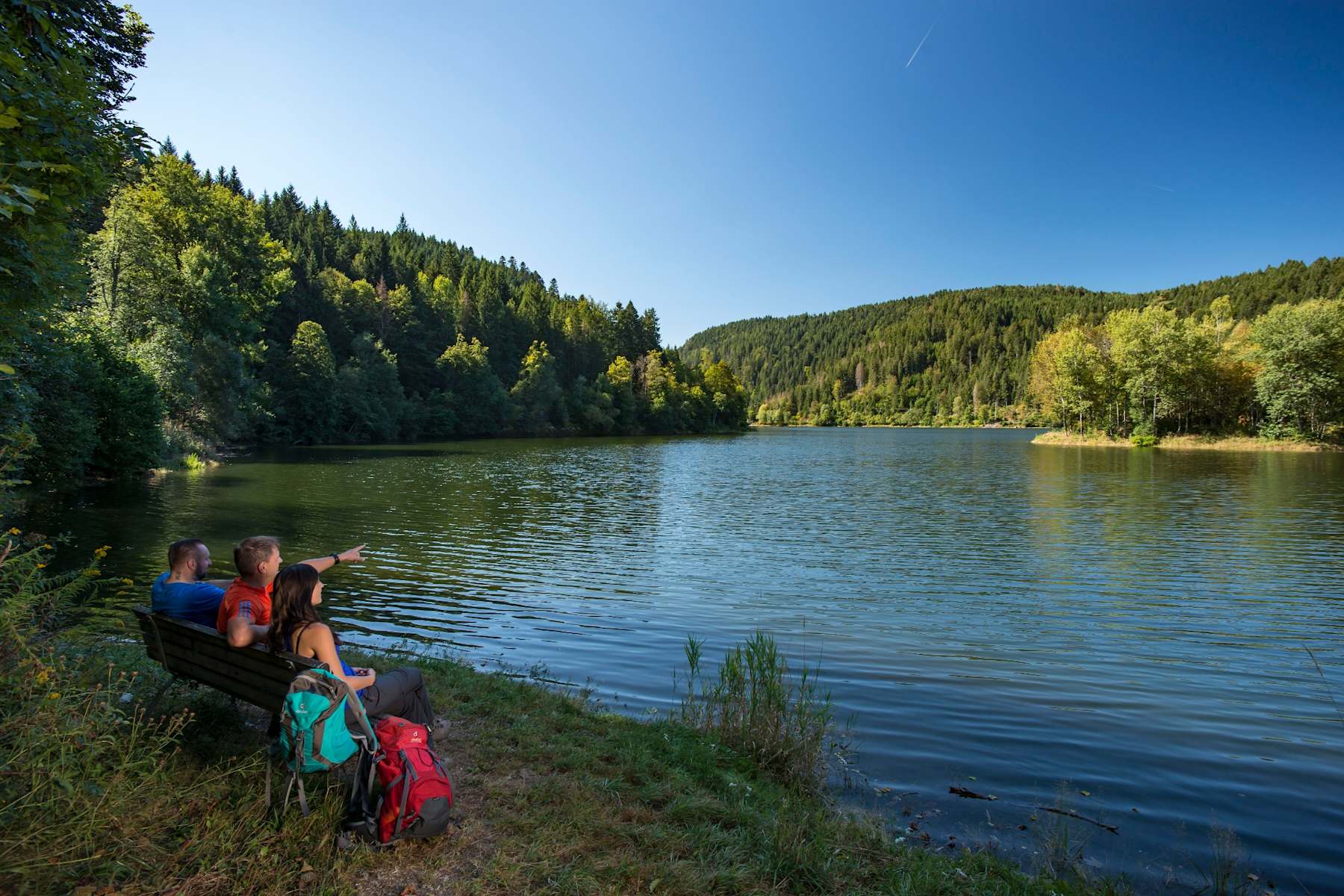 Vom Bildsteinfelsen führt der Weg teils sehr steil hinab in die Hänge des Albtals. An einem breiten Forstweg angekommen, zweigt der Weg links ab und folgt diesem bis zum Albstausee. Hier laden verschiedene Rastbänke und eine Wassertretstelle zum Verweilen ein.