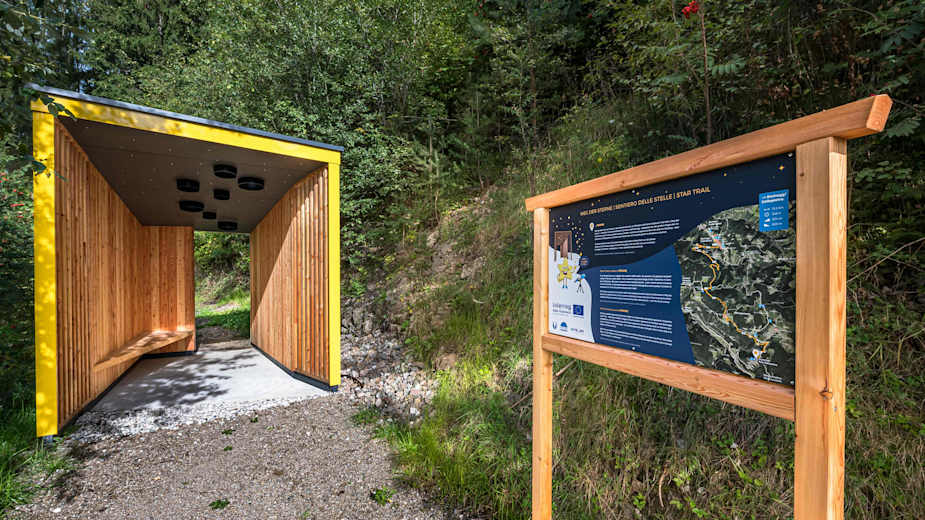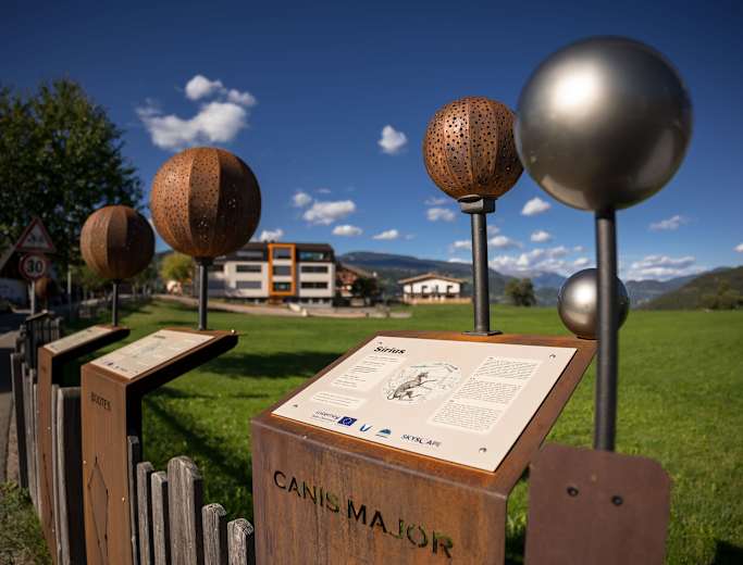 Immer auf dem Weg 1B erreichst du auch die Station 3 mit einer drehbaren Sternenkarte. Immer diesen Weg weiter folgend gelangst du zur Stern - und Sonnenwarte (Station 4) in Obergummer mit einem wunderbaren Panorama und einem einzigartigen Blick auf das Dolomitenmassiv des Latemars. Hier kannst du auch beim Untereggerhof einkehren.