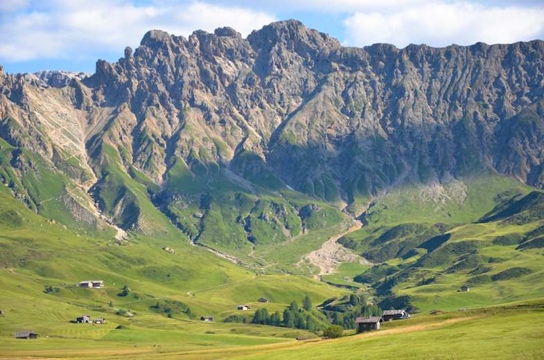 Nach dem Mittagessen müssen nicht mehr viele Höhenmeter zurückgelegt werden. Während der ganzen Tour hat man eine sagenhafte Aussicht auf die Dolomitengipfel wie den Rosengarten, die Langkofelgruppe und sogar auf den höchsten Berg der Dolomiten, die Marmolata.
